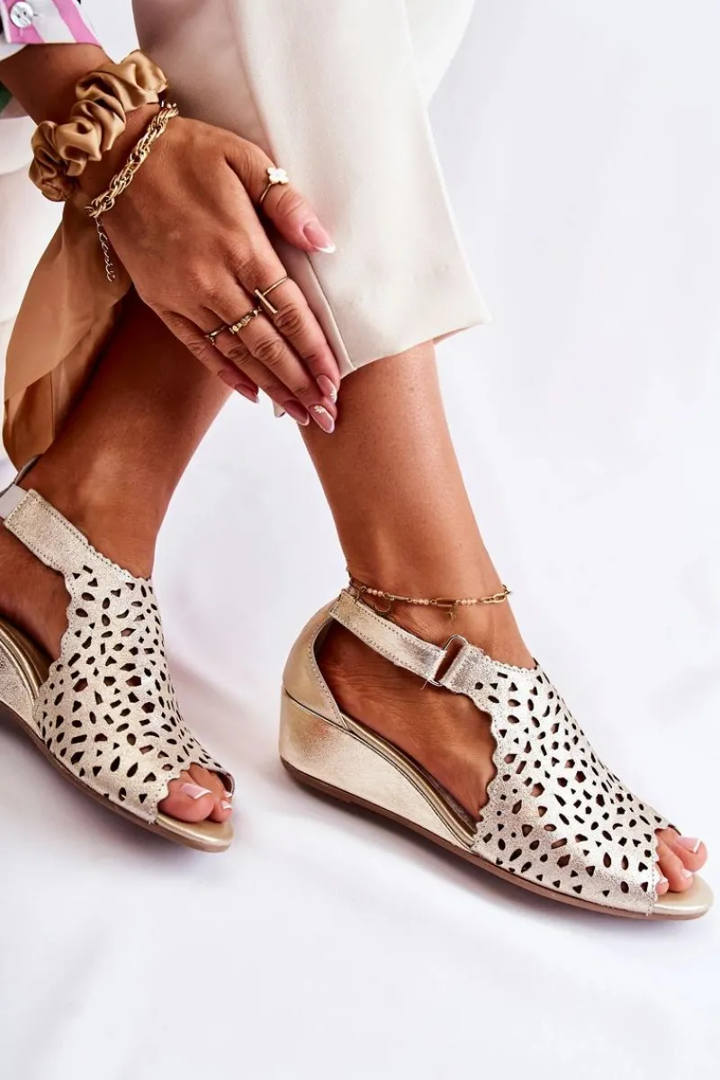 Sandały damskie wykonane z naturalnej skóry w ażurowy wzór. Zapinane przy kostce na rzep. Dodatkowo znajduje się także gumka przy usztywnianym zapiętku, co pozwoli na odpowiednie dopasowanie obuwia. Buty są osadzone na koturnie. Sandały posiadają odkryty, zaokrąglony nosek. Miękka wkładka wykonana także z naturalnej skóry pozwoli na wygodne użytkowanie obuwia. Fason idealny na upalne dni! Przy wyborze rozmiaru prosimy sugerować się tabelą rozmiarów.