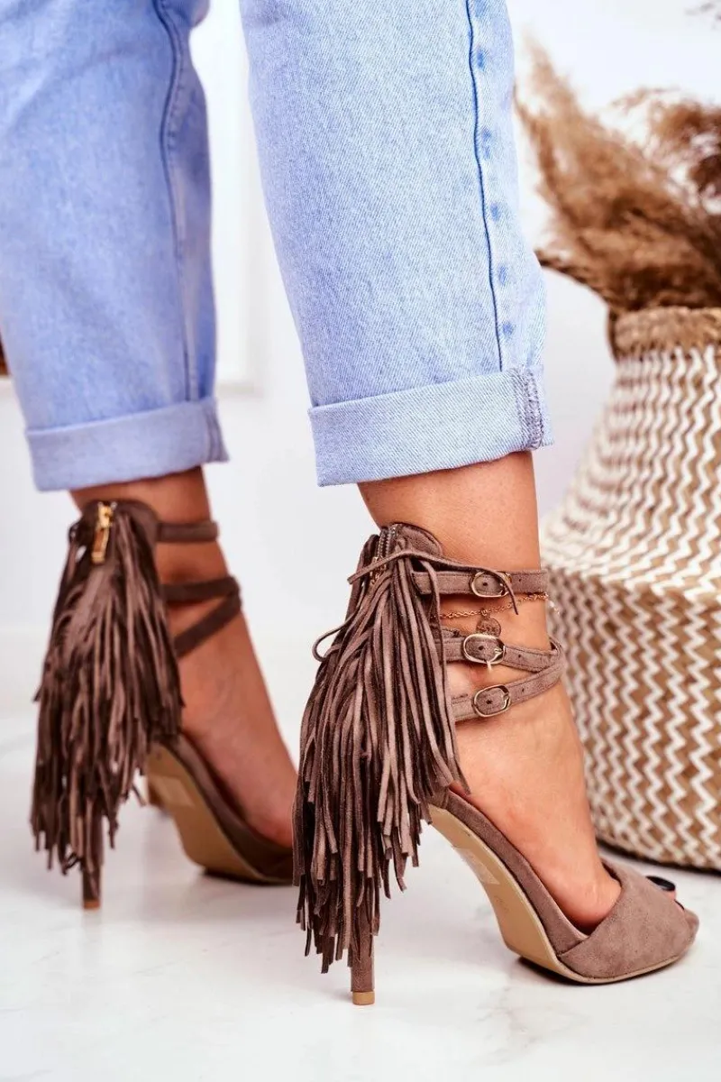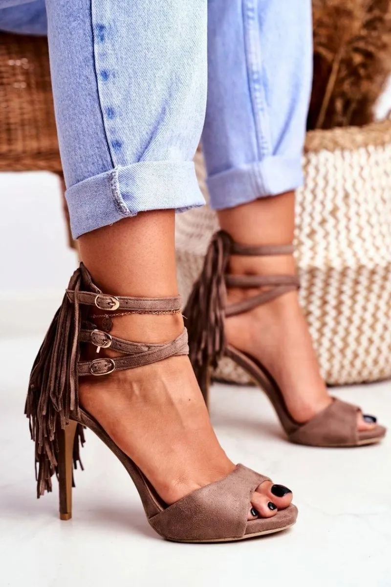 Poczuj się seksownie z sandałkami niczym z brazylijskiego karnawału! Wysoka szpilka uniesie Twoją sylwetkę, podkreślając i eksponując to, co mamy najpiękniejsze. Potrójne, klasyczne zapięcie na paseczkach dobrze przytrzymają twoją stopę, a liczne frędzle dodają odrobinę szaleństwa do Twojej stylizacji! Przy wyborze rozmiaru prosimy sugerować się tabelą rozmiarów.