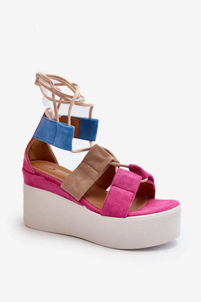 Sandały damskie osadzone na grubej platformie oraz koturnie. Wykonane z eko zamszu. Model ten posiada modne wiązanie wokół kostki. Lekko profilowana wkładka z eko skóry zapewni wygodę podczas użytkowania. Fason ten dopasujesz do wielu stylizacji z letnimi sukienkami, spódnicami oraz spodniami! Przy wyborze rozmiaru prosimy sugerować się tabelą rozmiarów.