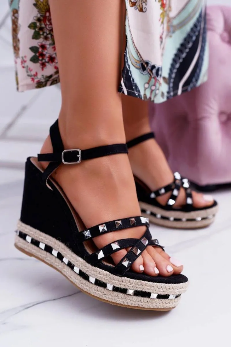 Sandały Na Koturnie>Boto Damskie Czarne Sandały Na Koturnie Ćwieki Amare