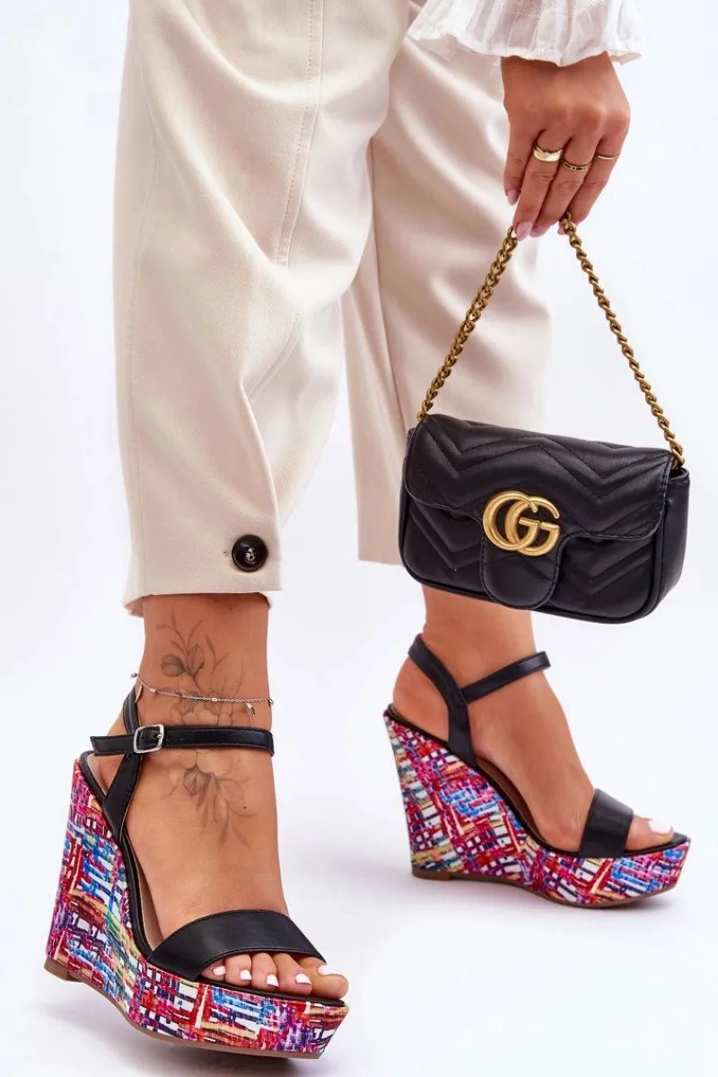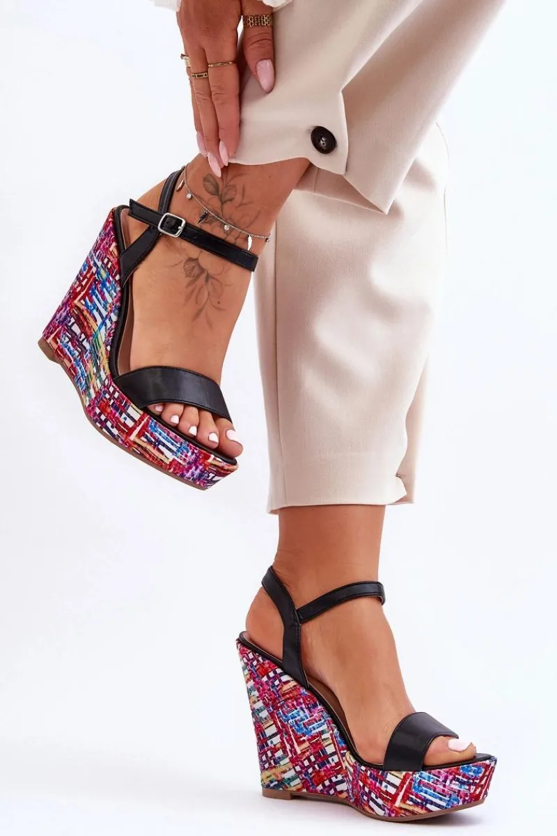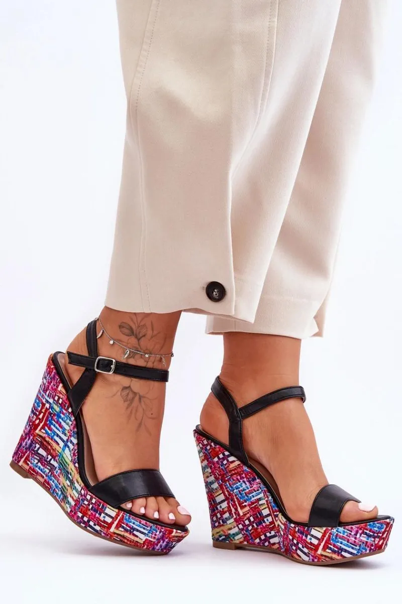 Sandały Na Koturnie>Boto Damskie Sandałki Na Kolorowym Koturnie Czarne Malibu