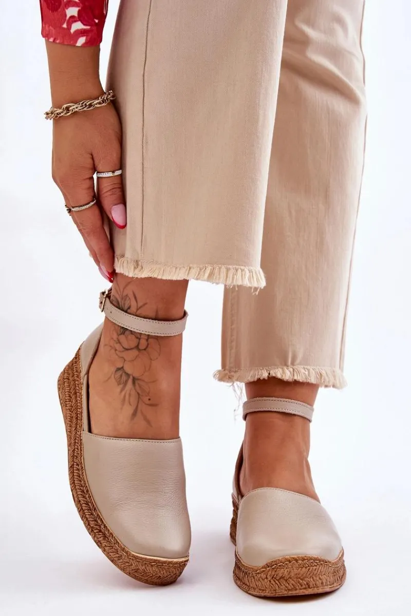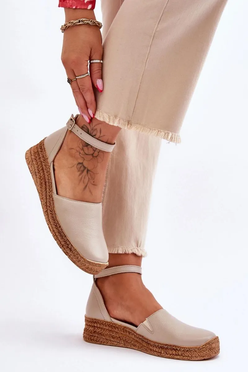 Espadryle osadzone na platformie oraz koturnie zostały wykonane z naturalnej skóry. Zapinane wokół kostki na sprzączkę z regulowanym paskiem. Platforma została wykonana z tworzywa z imitacją plecionki. Miękka wkładka z naturalnej skóry pozwoli na komfortowe użytkowanie. Sprawdź także pozostałe modele espadryli dostępne w naszej ofercie!Przy wyborze rozmiaru prosimy sugerować się tabelą rozmiarów.