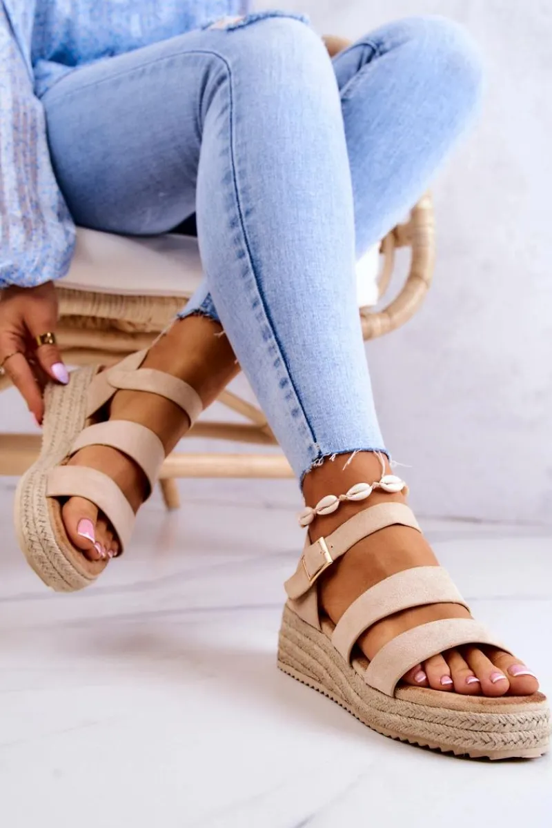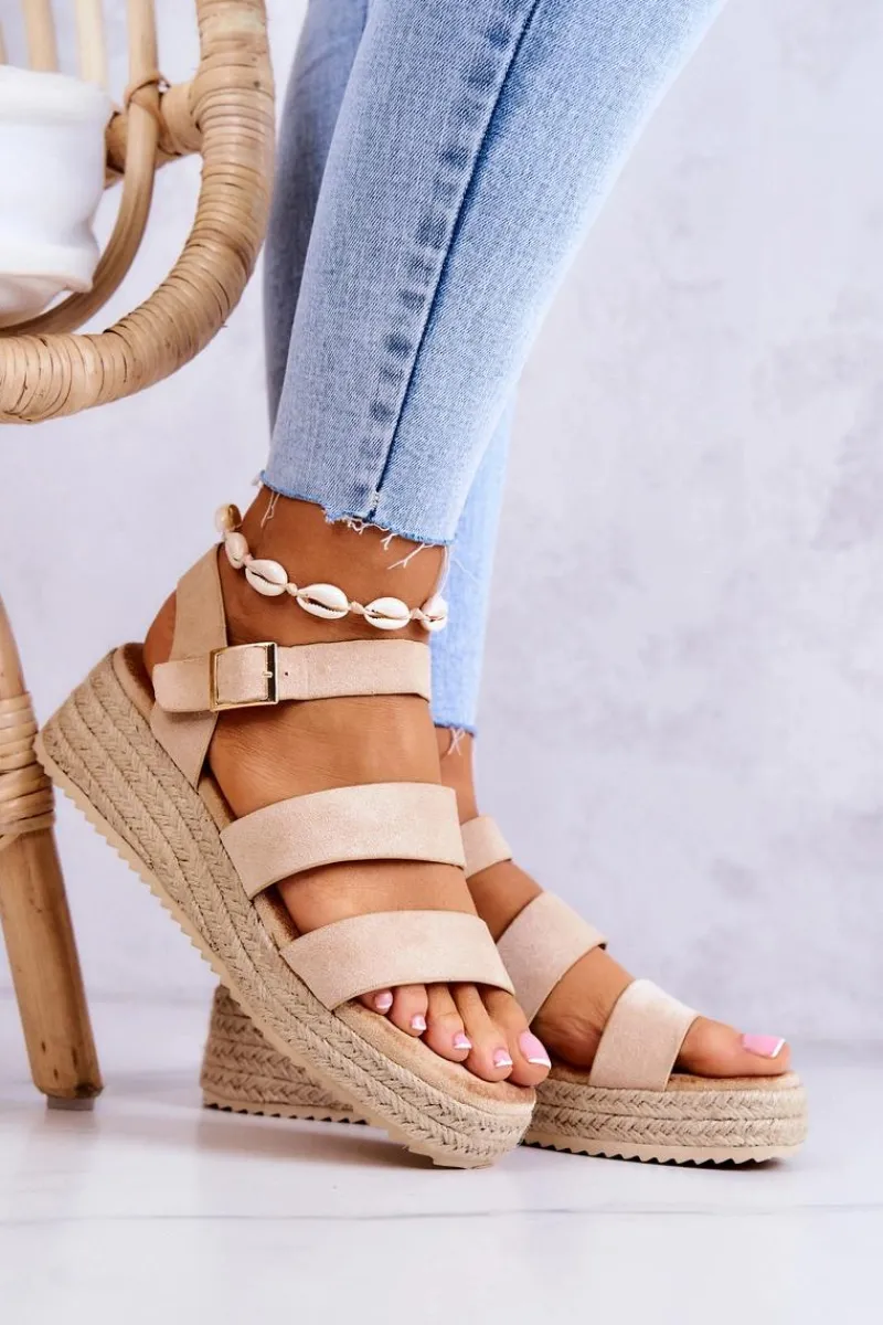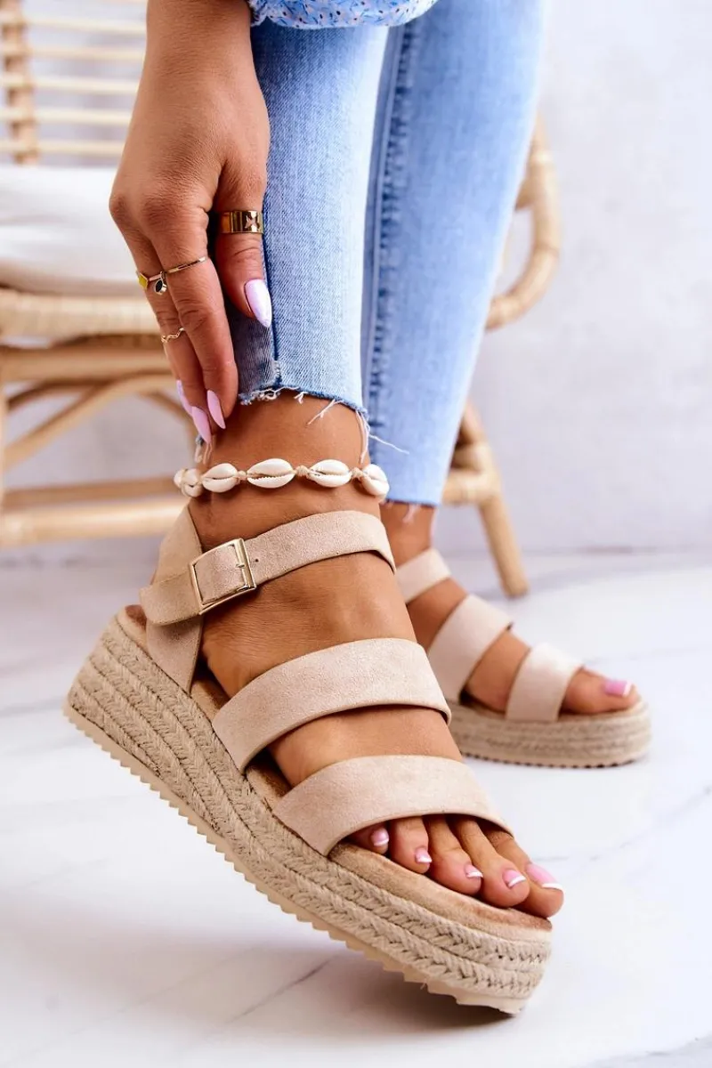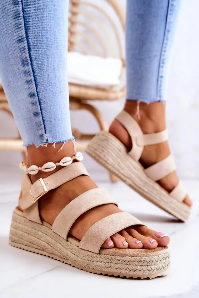 Sandały na niewysokim koturnie, wykończone jutowym warkoczem. Z szerokimi paskami oraz regulowanym paskiem przy kostce zapinanym na kwadratową sprzączkę. Wyposażone w miękką, komfortową wkładkę. Wykonane z zamszowej eko skóry. Te sandały idealnie sprawdzą się do basicowych stylizacji, sukienek boho czy nawet klasycznych jeansów. Przy wyborze rozmiaru prosimy kierować się tabelą rozmiarów.