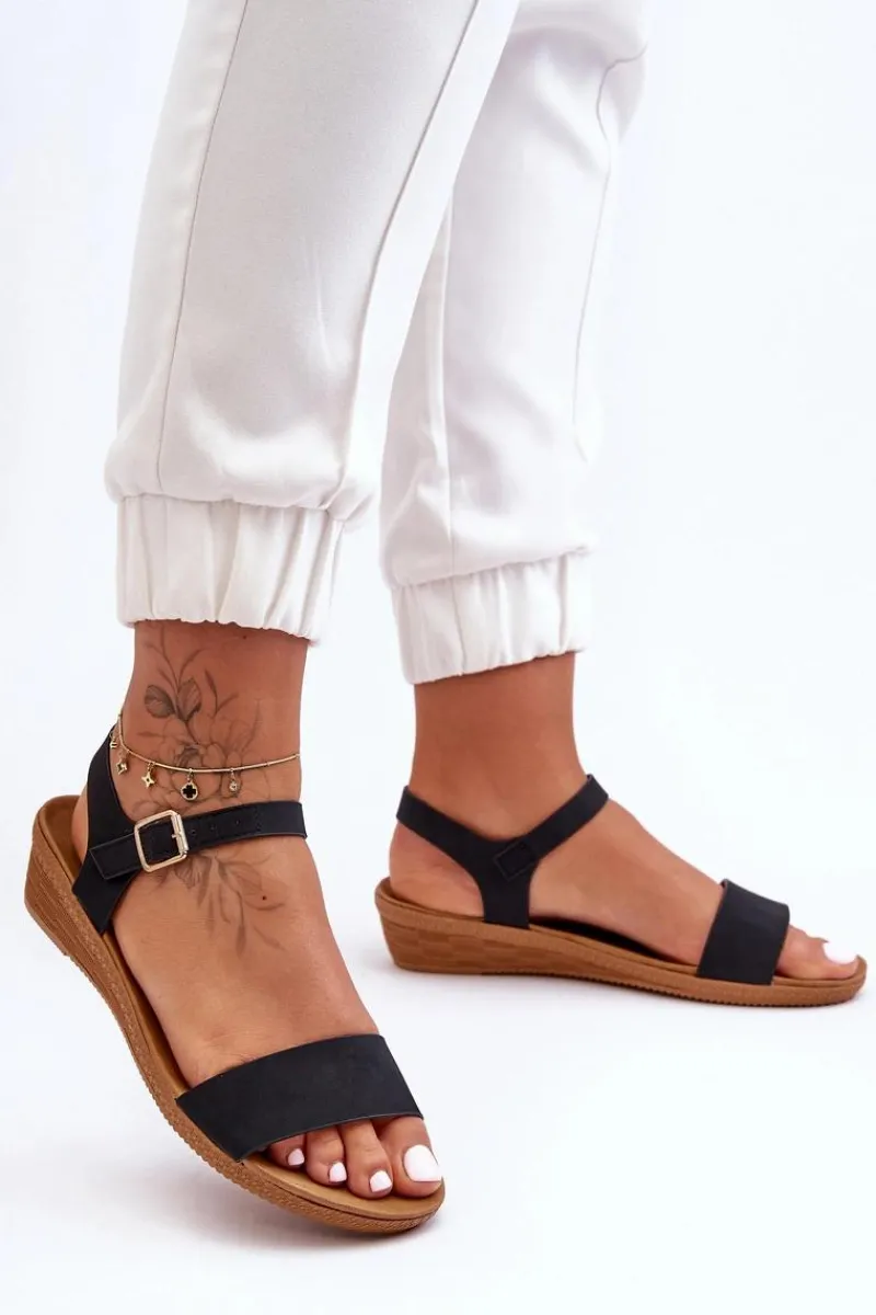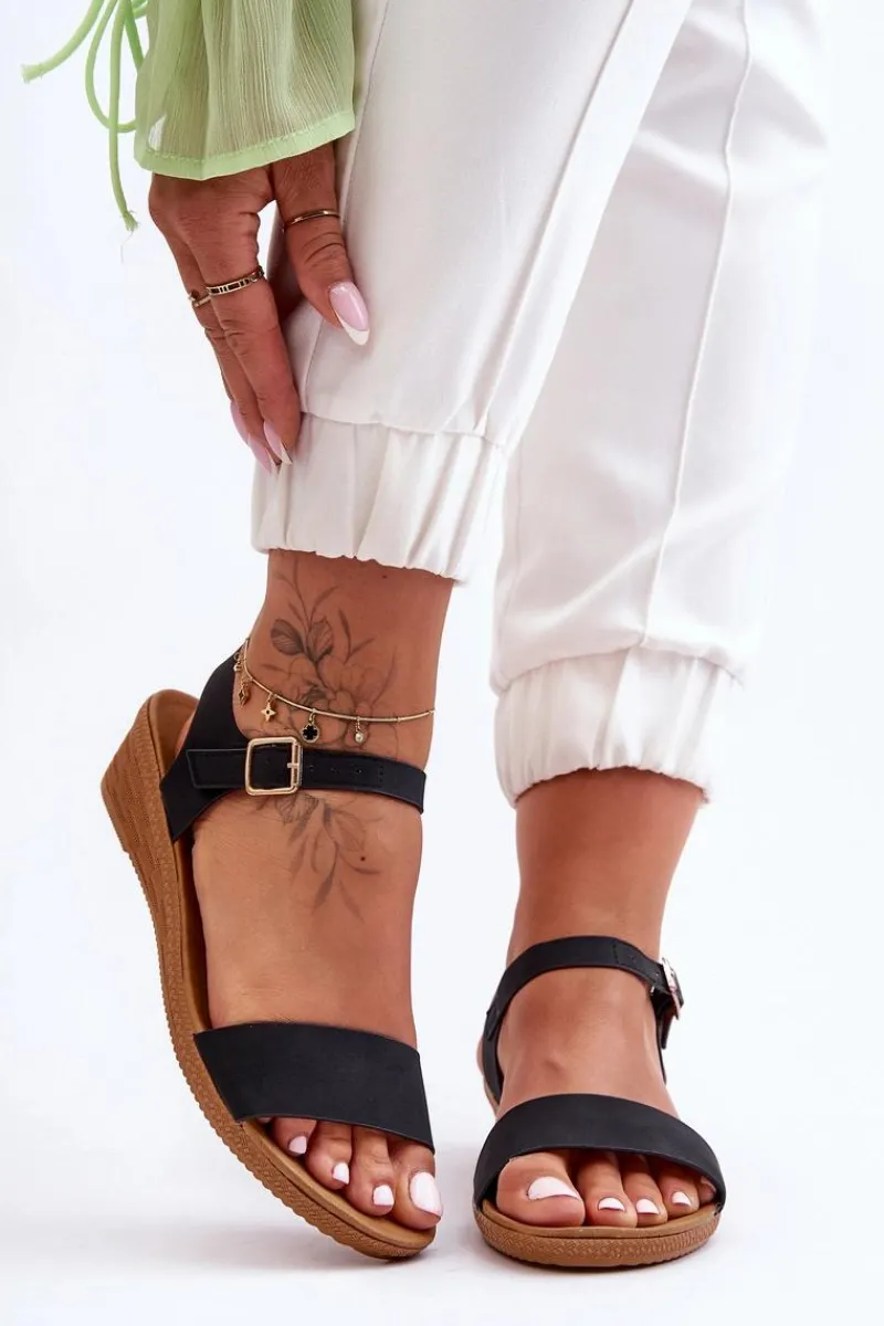 Sandałki damskie osadzono na niskim koturnie i delikatnej platformie. Model ten został wykonany z eko skóry. Wygodna wkładka zapewni komfortowe użytkowanie obuwia. Model jest zapinany na regulowany pasek ze sprzączką. Ten model idealnie sprawdzi się na upalne dni! Przy wyborze rozmiaru prosimy kierować się tabelą rozmiarów.