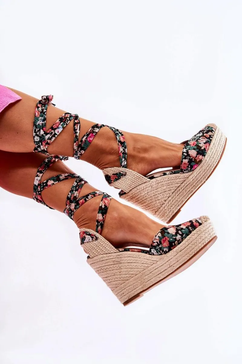 Sandały damskie osadzone na koturnie i platformie. Wykonane z tkaniny. Podeszwa jest gumowa i antypoślizgowa. Eko skórzana wkładka zadba o Twój komfort i wygodę. Zabudowane na nosku ażurową cholewką. Wiązane materiałowym paskiem wokół kostki. Sandały świetnie sprawdzą się w letnich stylizacjach. Przy wyborze rozmiaru prosimy sugerować się tabelą rozmiarów.