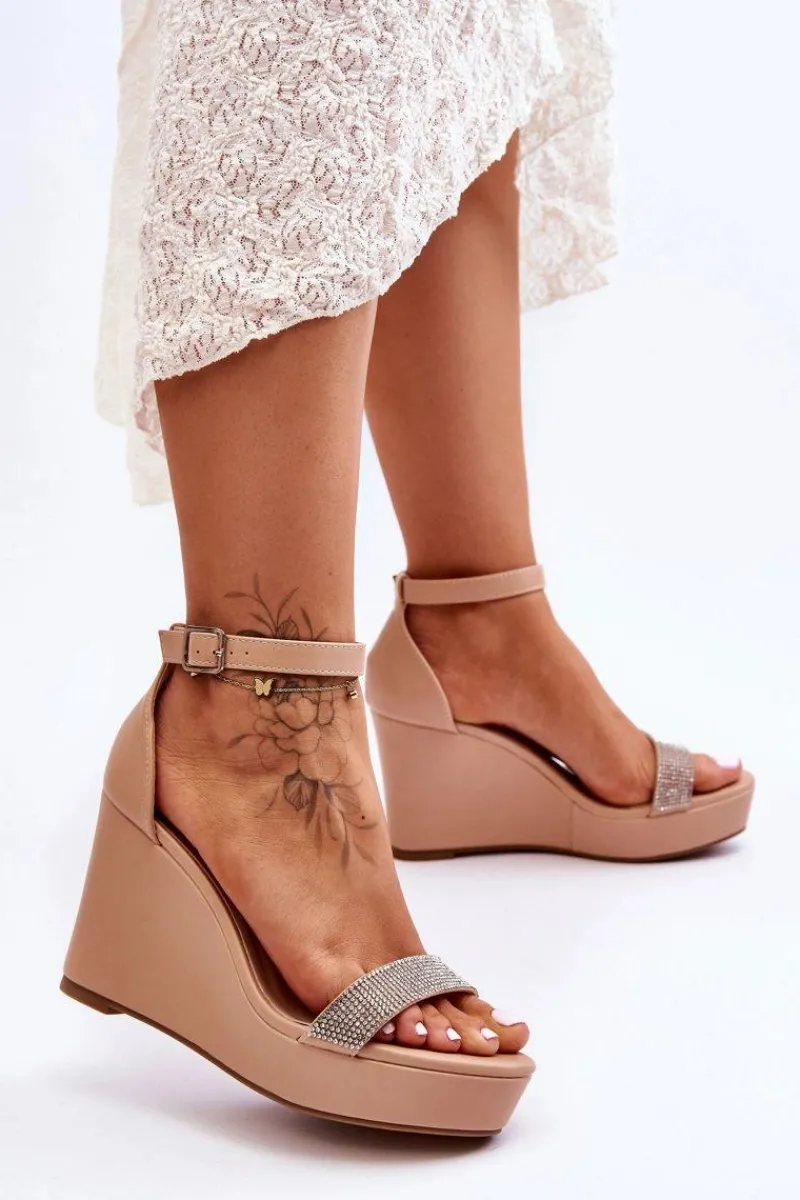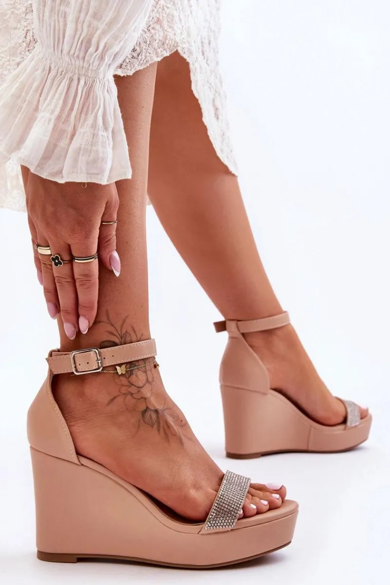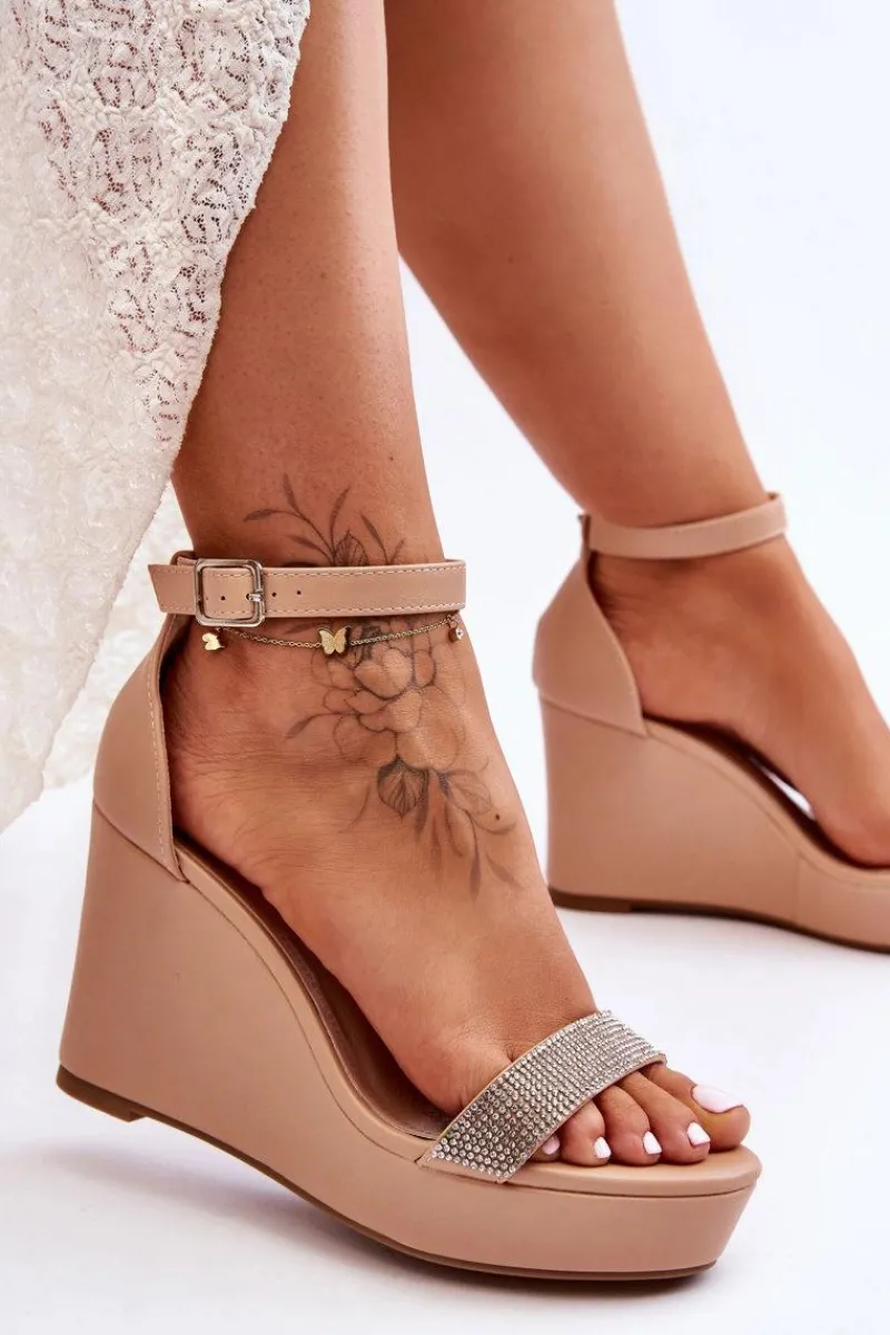 Cudowne, damskie sandały zostały wykonane z eko skóry. Posiadają zdobienia w postaci dżetów imitujących cyrkonie. Miękka wkładka z perforacją zapewni komfortowe użytkowanie obuwia. Dodatkowo zapiętek w tych butach jest usztywniany. Sandałki osadzono na platformie i koturnie. Model ten jest zapinany na regulowany pasek ze sprzączką. Przy wyborze rozmiaru prosimy sugerować się tabelą rozmiarów.