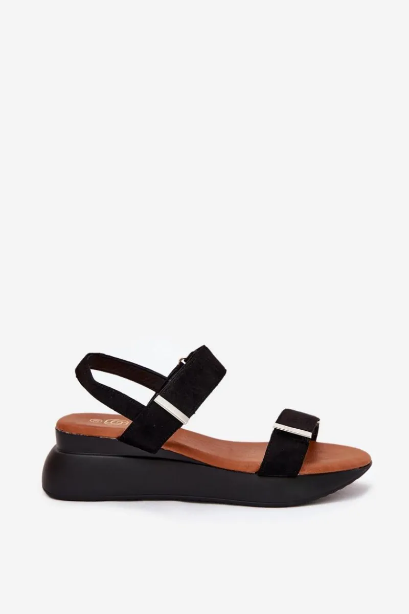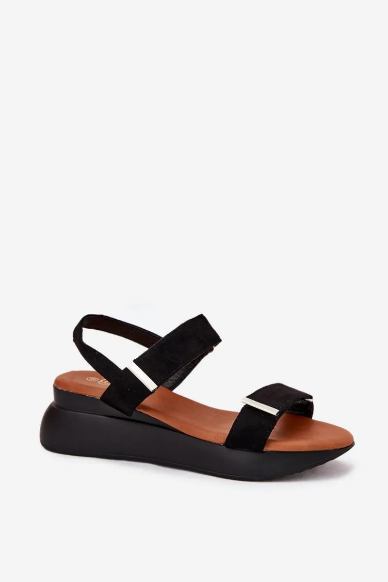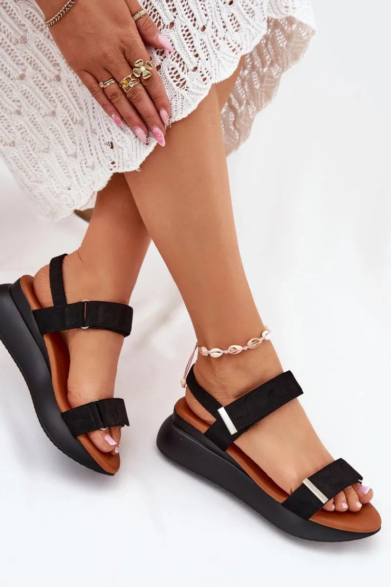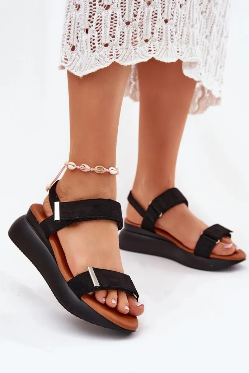 Sandały damskie z eko zamszu, osadzone na koturnie, to wygodna i stylowa propozycja na ciepłe dni. Zapinane na podwójny rzep, pozwalają na łatwe dopasowanie do stopy, zapewniając komfort przez cały dzień. Miękka wkładka zwiększa wygodę noszenia, a koturn dodaje subtelnej wysokości. Idealne na co dzień, łączą funkcjonalność z modnym wyglądem. Przy wyborze rozmiaru prosimy sugerować się tabelą rozmiarów.