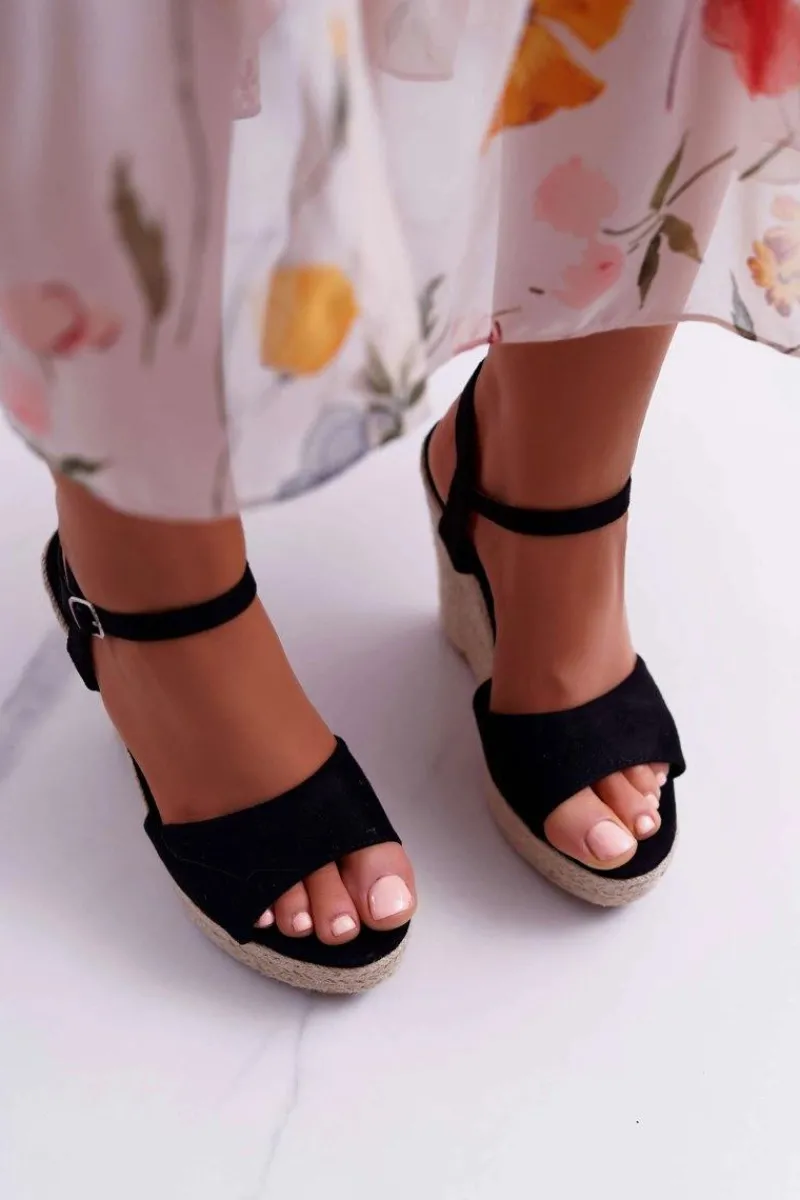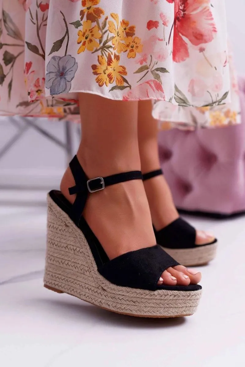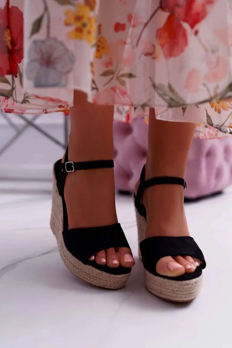 Niezwykle piękne i modne sandały na lnianej koturnie! Zamszowy materiał z klasycznym zapinaniem w postaci paska wokół kostki. Model osadzony na wygodnym koturnie. Idealne do letnich stylizacji. Przy wyborze rozmiaru prosimy sugerować się tabelą rozmiarów.