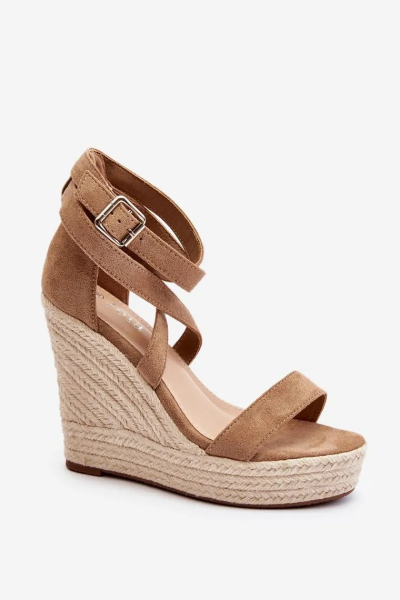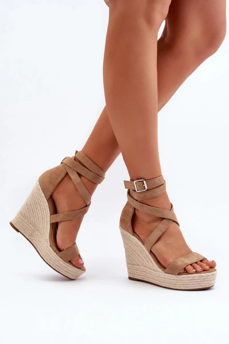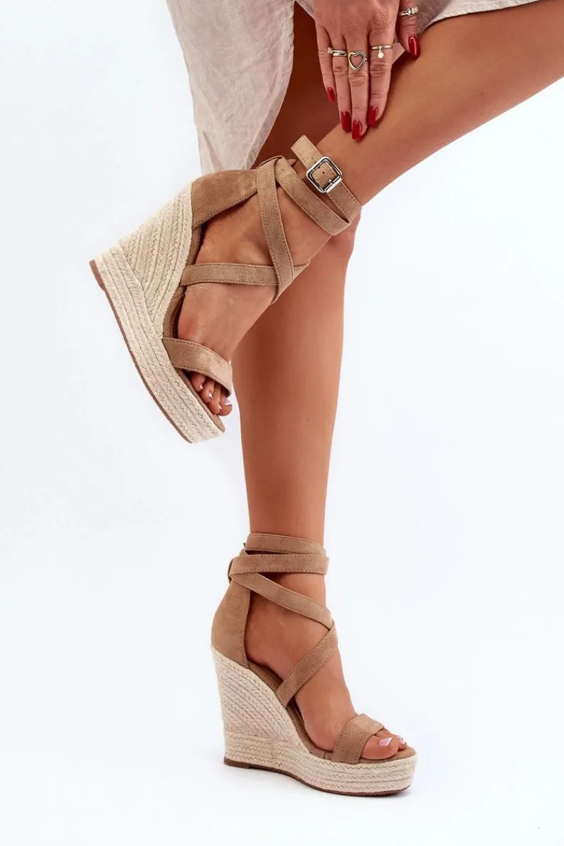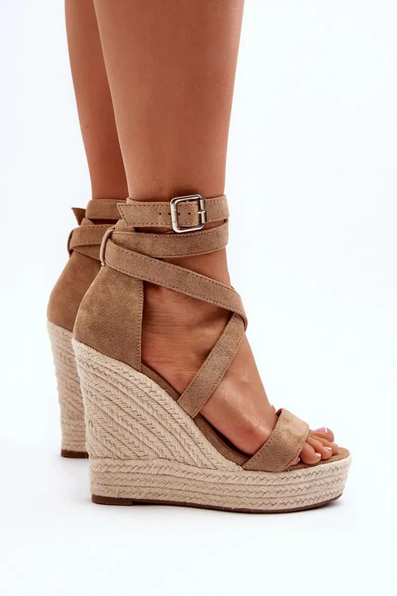 Sandały damskie wykonane z eko zamszu. Osadzone na koturnie i platforma z jutową plecionką. Zapinane na regulowany pasek ze sprzączką. Model ten to doskonałe rozwiązanie dla osób poszukujących obuwia, które łączy wygodę i elegancję, szczególnie podczas długich letnich spacerów! Przy wyborze rozmiaru prosimy sugerować się tabelą rozmiarów.