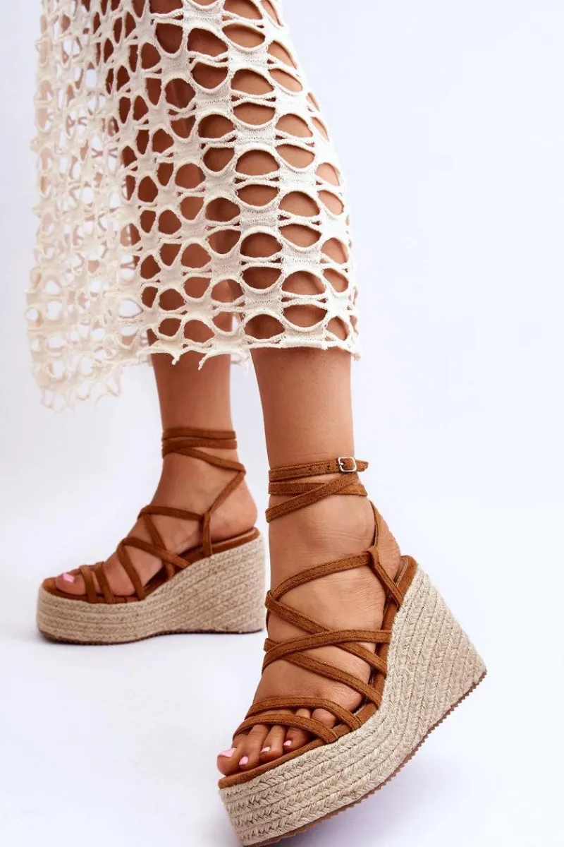 Idealne sandały na lato! Posiadają wysoki koturn oraz platformę ozdobione jutową plecionką. Posiadają odkryty, kwadratowy nosek. Sandałki są zapinane na długi, regulowany pasek ze sprzączką. Niezwykle miękka, wykonana z eko skóry wkładka jest bardzo wygodna w użytkowaniu nawet przez cały dzień. Te buty będą znakomitym dodatkiem do zwiewnej sukienki czy spódniczki. Przy wyborze rozmiaru prosimy kierować tabelą rozmiarów.