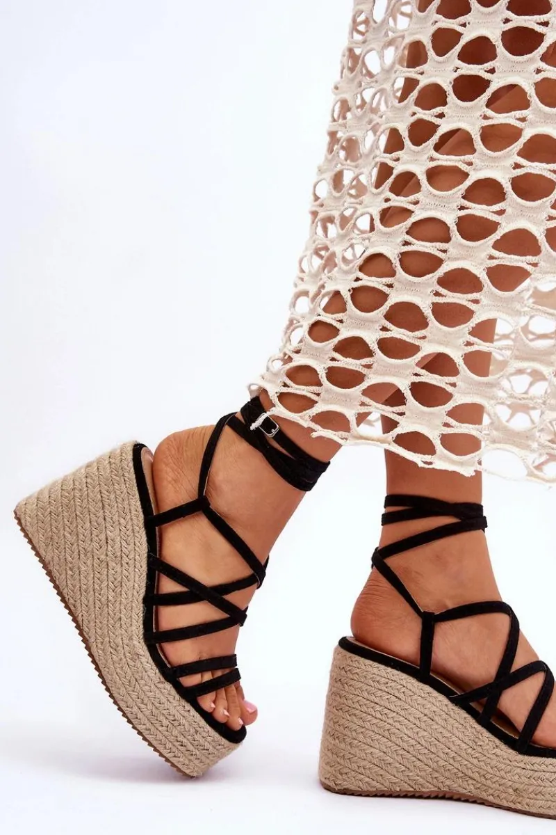 Idealne sandały na lato! Posiadają wysoki koturn oraz platformę ozdobione jutową plecionką. Posiadają odkryty, kwadratowy nosek. Sandałki są zapinane na długi, regulowany pasek ze sprzączką. Niezwykle miękka, wykonana z eko skóry wkładka jest bardzo wygodna w użytkowaniu nawet przez cały dzień. Te buty będą znakomitym dodatkiem do zwiewnej sukienki czy spódniczki. Przy wyborze rozmiaru prosimy kierować tabelą rozmiarów.