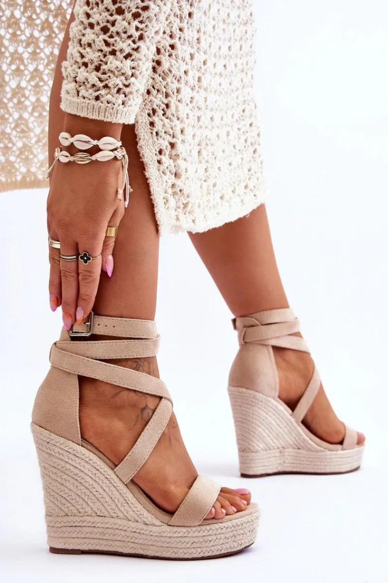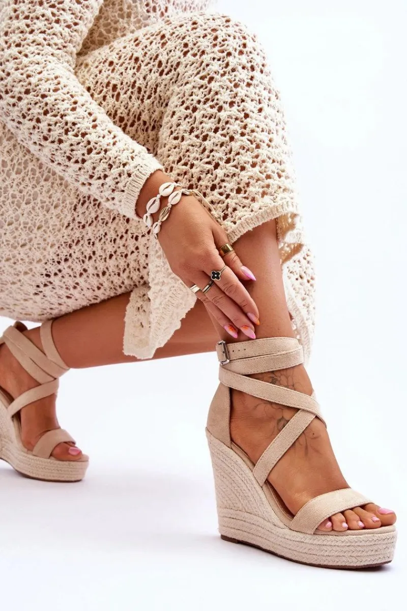 Wygodne sandały na koturnie i platformie z plecionką. Model ten jest zapinany na regulowany pasek ze sprzączką. Sandały zostały wykonane z eko zamszu. Posiadają podeszwę z tworzywa sztucznego. Ten wyjątkowy model z pewnością wzbogaci Twoją letnią garderobę! Sandałki są idealne do zwiewnych sukienek. Świetnie sprawdzą się w upalne dni.Przy wyborze rozmiaru prosimy sugerować się tabelą rozmiarów.