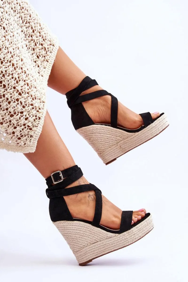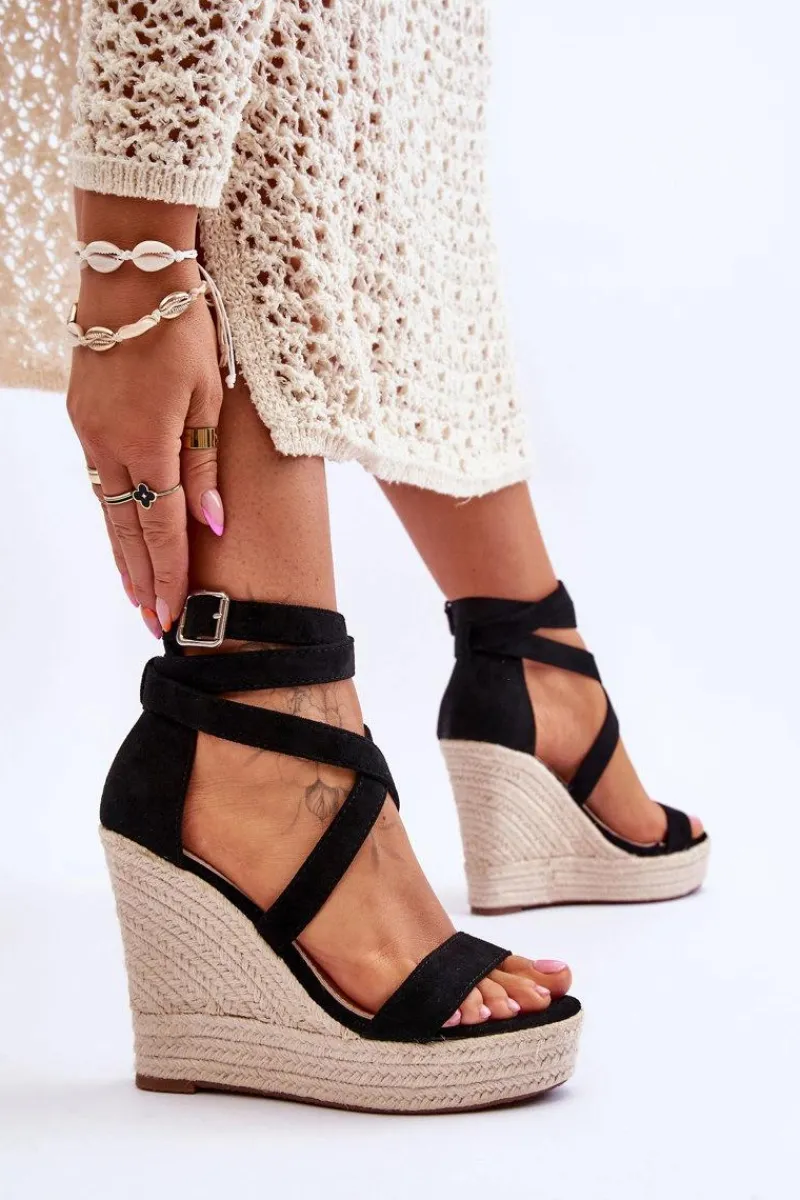 Wygodne sandały na koturnie i platformie z plecionką. Model ten jest zapinany na regulowany pasek ze sprzączką. Sandały zostały wykonane z eko zamszu. Posiadają podeszwę z tworzywa sztucznego. Ten wyjątkowy model z pewnością wzbogaci Twoją letnią garderobę! Sandałki są idealne do zwiewnych sukienek. Świetnie sprawdzą się w upalne dni.Przy wyborze rozmiaru prosimy sugerować się tabelą rozmiarów.