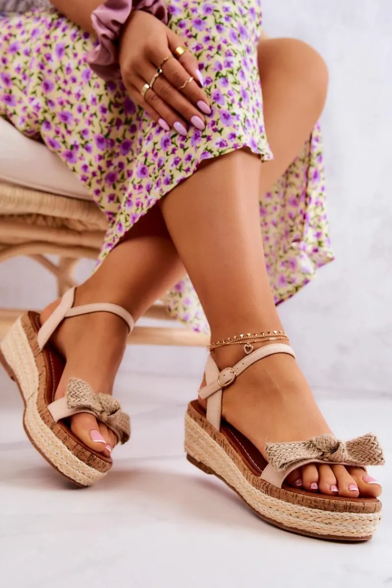 Sandały na platformie i koturnie z jutowymi warkoczami. Odkryte na nosku, pięcie i po bokach. Posiadają regulowany pasek zapinany na wysokości kostki na sprzączkę. Wykonane z przyjemnego w dotyku eko zamszu. Możesz nosić je na wiele sposobów – do spódnic oraz sukienek maxi czy klasycznych szortów. Jutowa kokardka na przodzie jest przyszyta do paseczka. Miękka, eko skórzana wkładka to gwarancja komfortu nawet przez cały dzień! Przy wyborze rozmiaru prosimy sugerować się tabelą rozmiarów.