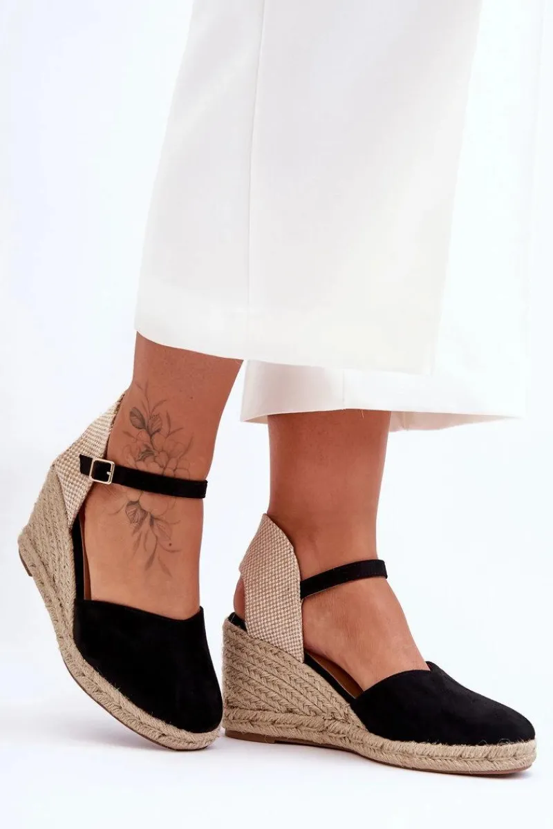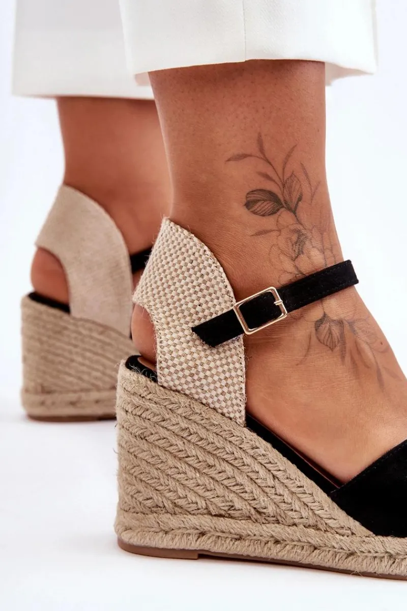 Modne sandały damskie zostały wykonane z połączenia eko zamszu oraz tkaniny. Sandałki te posiadają zapinanie w postaci regulowanego paska. Koturn i platforma zostały ozdobione jutową plecionką. Podeszwa w tych butach jest gumowa i antypoślizgowa. Miękka wkładka zadba o Twój komfort i wygodę. Przy wyborze rozmiaru prosimy sugerować się tabelą rozmiarów.