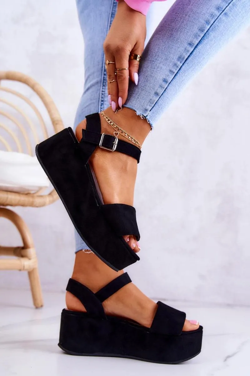 Piękne oraz wygodne sandały na koturnie wykonane z eko zamszu. Buty posiadają miękką wkładkę z eko skóry. Modny fason, idealny na lato! Stabilna, masywna platforma pozwoli na użytkowanie butów nawet przez cały dzień! Zapinane na regulowany pasek ze sprzączką. Możesz nosić je zarówno do zwiewnych, długich sukienek, jak i klasycznych szortów. Przy wyborze rozmiaru prosimy sugerować się tabelą rozmiarów.