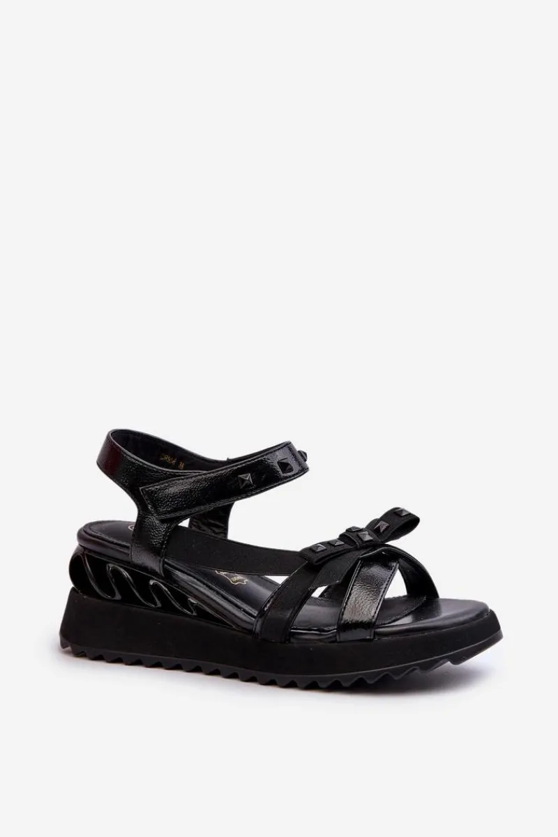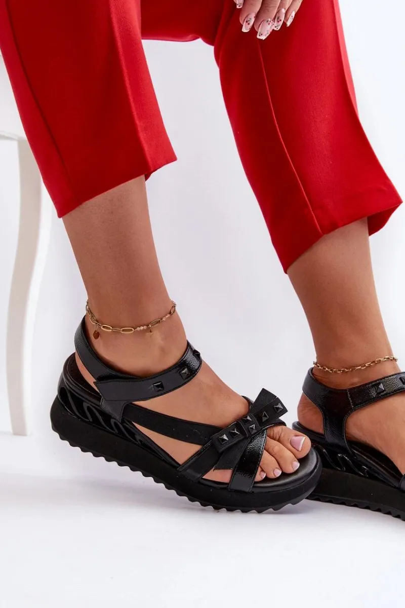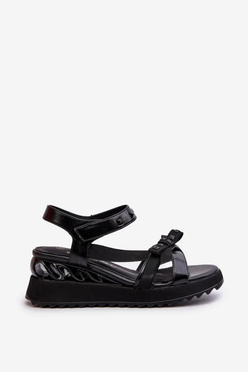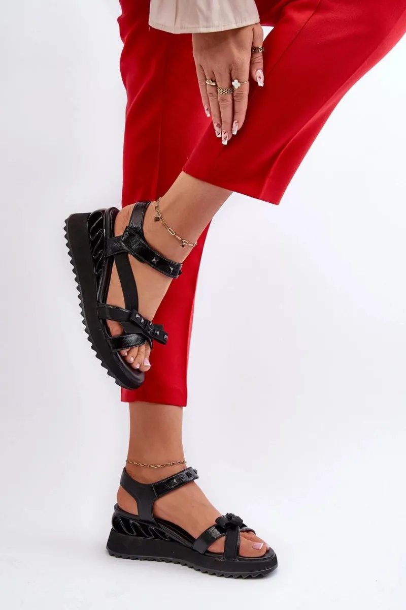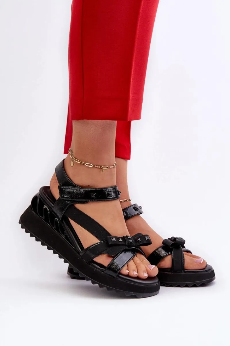 Niezwykle stylowe sandały damskie osadzone na platformie z koturnem. Praktyczne zapinanie na rzep zapewnia szybkie i wygodne dopasowanie do stopy. Kokardka z przodu nadaje im uroku i delikatności. Model ten pewnością przyciągnie spojrzenia! Przy wyborze rozmiaru prosimy sugerować się tabelą rozmiarów.