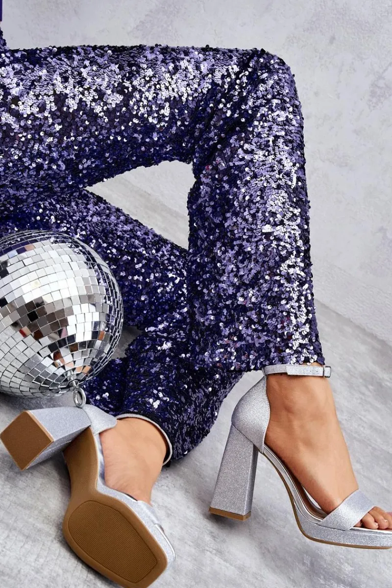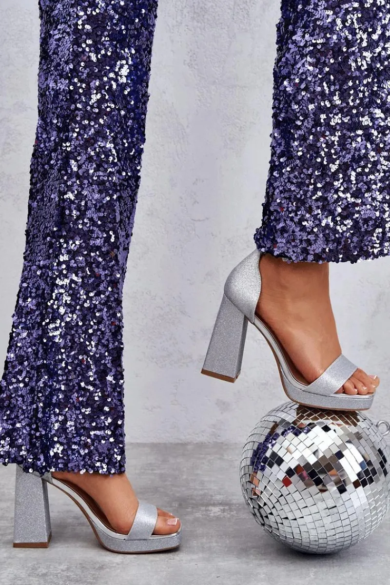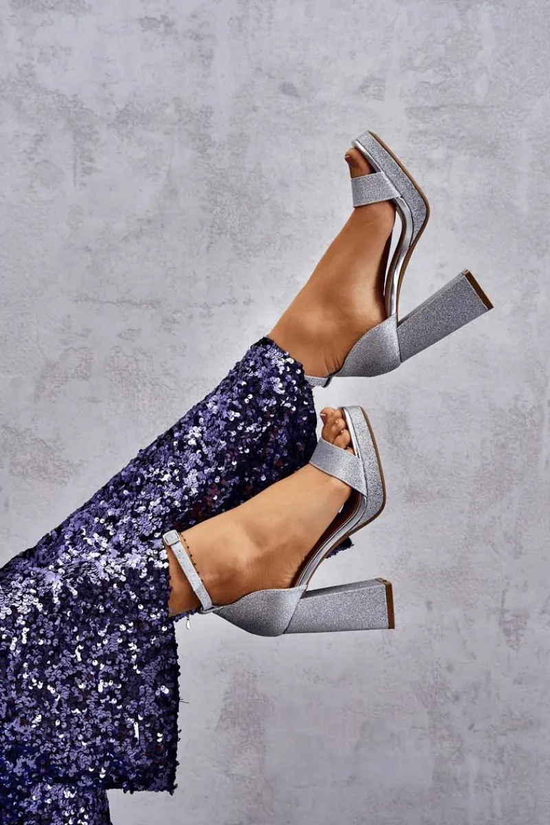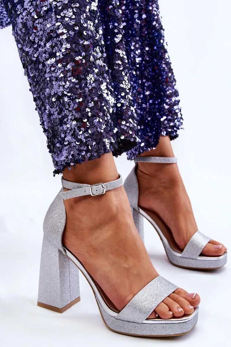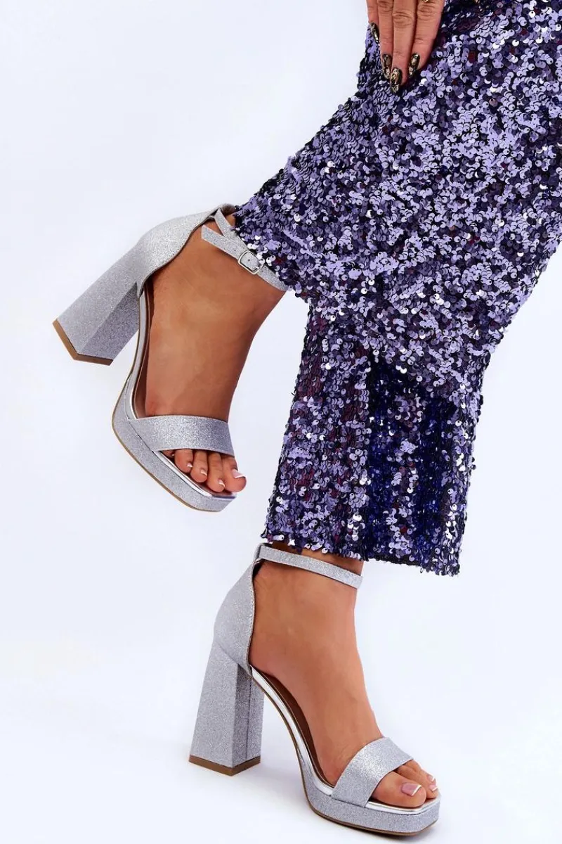 Piękne sandałki z mieniącymi się drobinkami idealnie sprawdzą się na imprezę! Posiadają z przodu paseczek przytrzymujący stopę oraz usztywniany zapiętek. Zapinane na regulowany pasek ze sprzączką. Delikatna platforma oraz masywny obcas w kształcie kwadratowego słupka. Miękka wkładka została wykonana z eko skóry. Przy wyborze rozmiaru prosimy kierować tabelą rozmiarów.