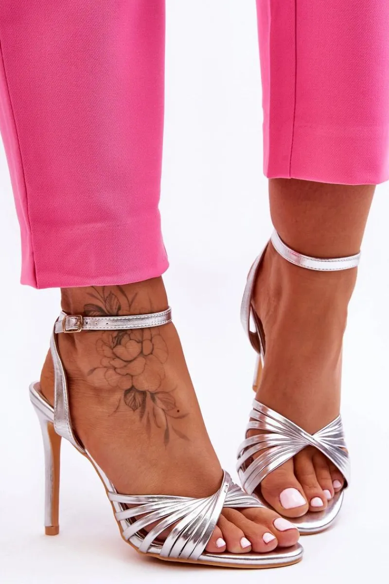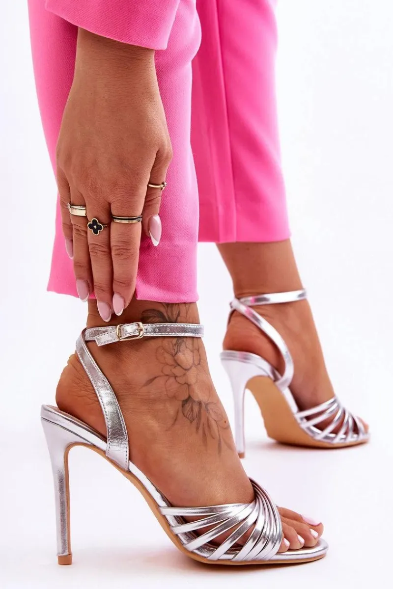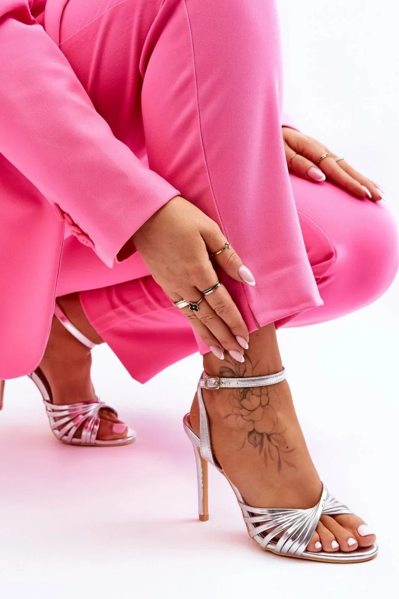 Te piękne sandałki damskie osadzono na obcasie w postaci szpilki. Model ten został wykonany z eko skóry. Sandałki posiadają na przodzie związane paseczki. Zapinane wokół kostki na regulowany pasek ze sprzączką. Te eleganckie sandałki z pewnością sprawdzą się w wielu stylizacjach na różnego rodzaju imprezy, spotkania czy uroczystości! Przy wyborze rozmiaru prosimy sugerować się tabelą rozmiarów.