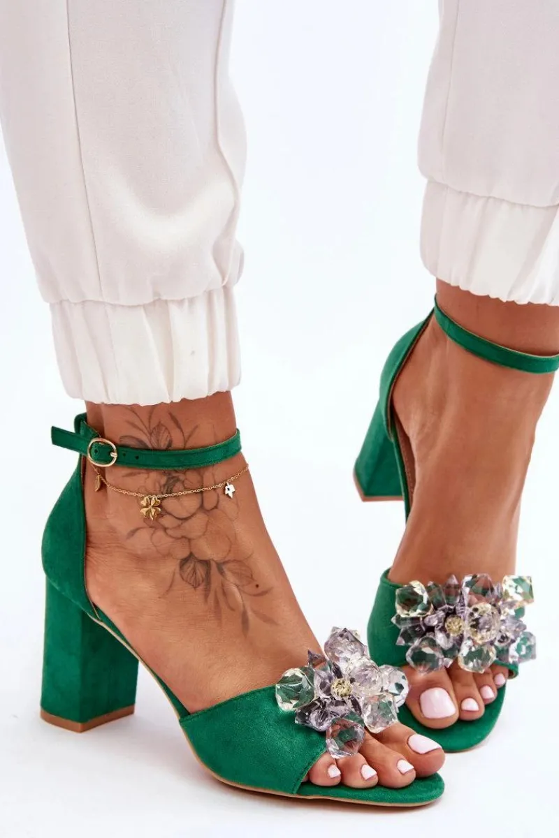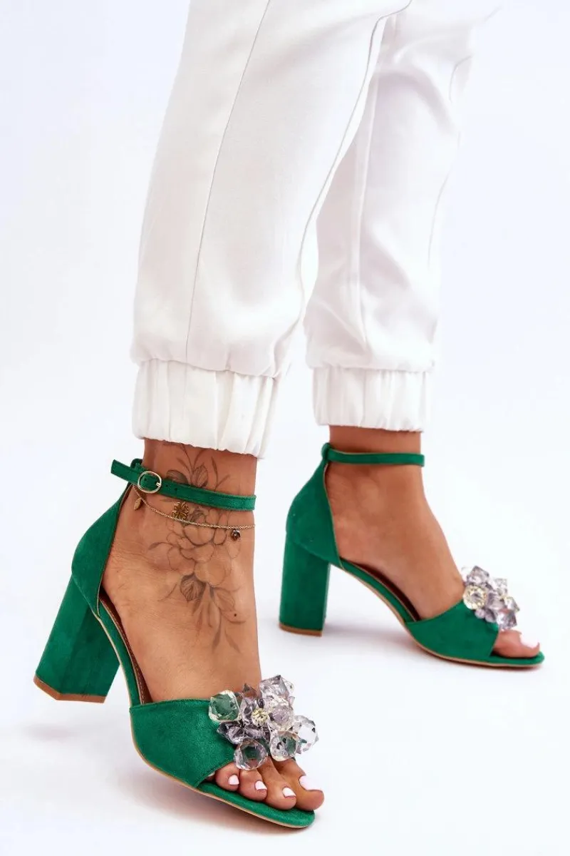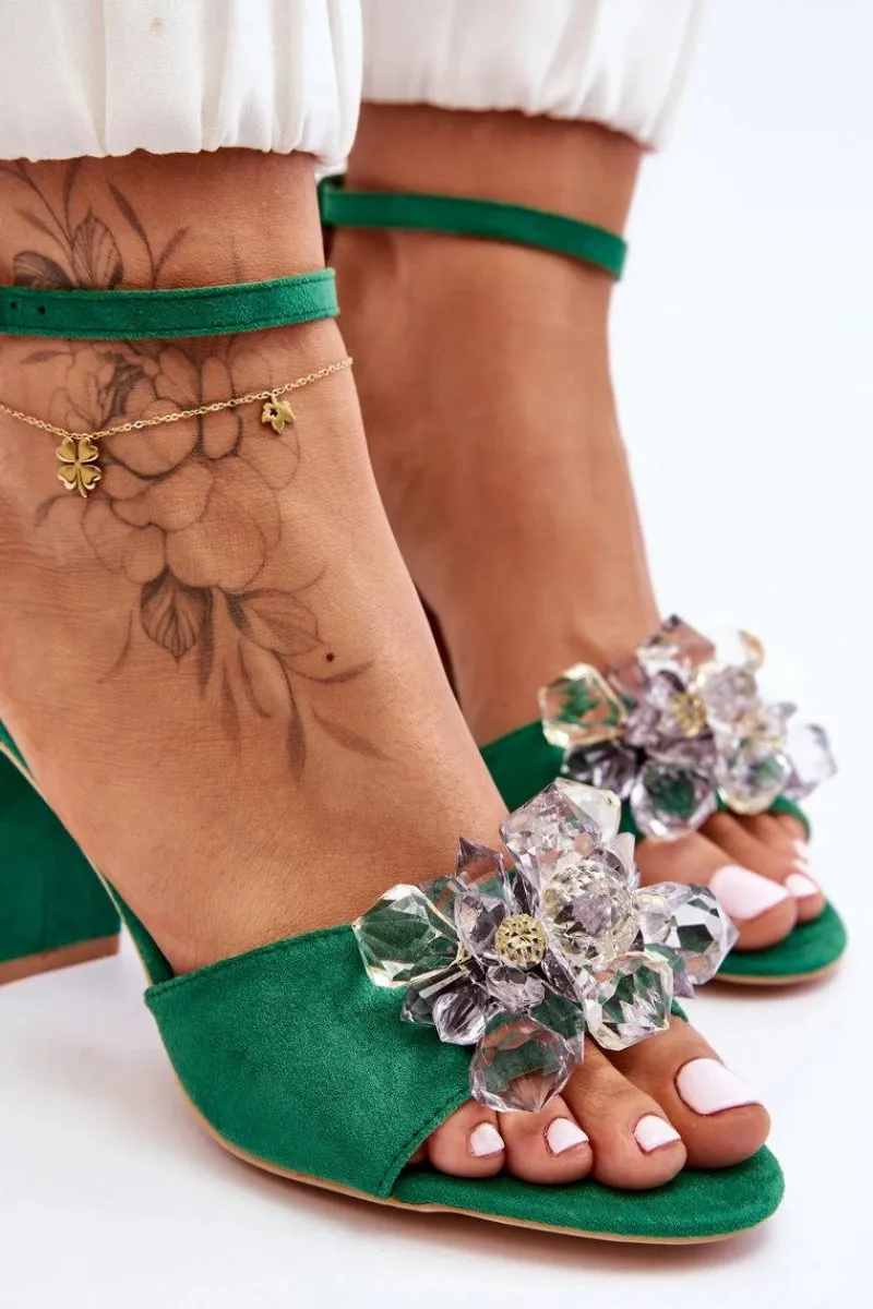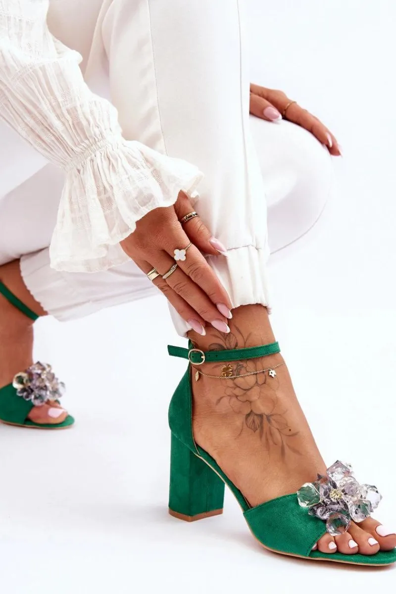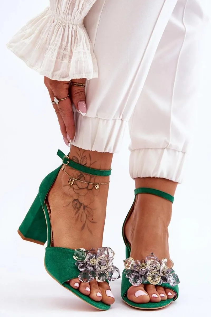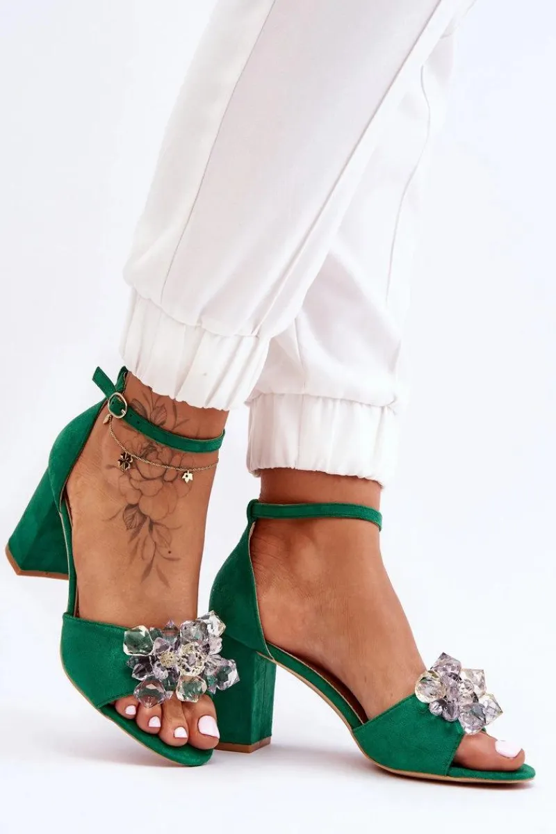 Niezwykłe sandały na obcasie w postaci słupka. Paseczek na przodzie został ozdobiony modnymi kryształkami, co dodaje tym butom elegancji. Miękka wkładka z eko skóry zadba o Twój komfort podczas użytkowania. Model ten świetnie sprawdzi się na różnego rodzaju ważnych uroczystościach czy spotkaniach biznesowych. Koniecznie powinnaś je mieć w swojej garderobie! Przy wyborze rozmiaru prosimy sugerować się tabelą rozmiarów.