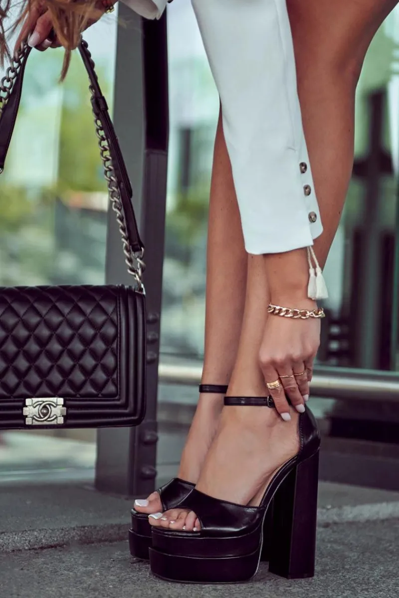 Uwielbiasz buty na wysokim obcasie? Jeżeli tak, to koniecznie powinnaś mieć ten model w swojej garderobie! Modne sandałki są osadzone na wysokim, masywnym słupku oraz platformie. Posiadają odkryty, kwadratowy nosek. Zapinane wokół kostki na regulowany pasek ze sprzączką. Dodatkowo posiadają usztywniany zapiętek. Wkładka jest miękka, wykonana z eko skóry. Z tym modelem Twoje stylizacje nabiorą charakteru! Przy wyborze rozmiaru prosimy sugerować się tabelą rozmiarów.