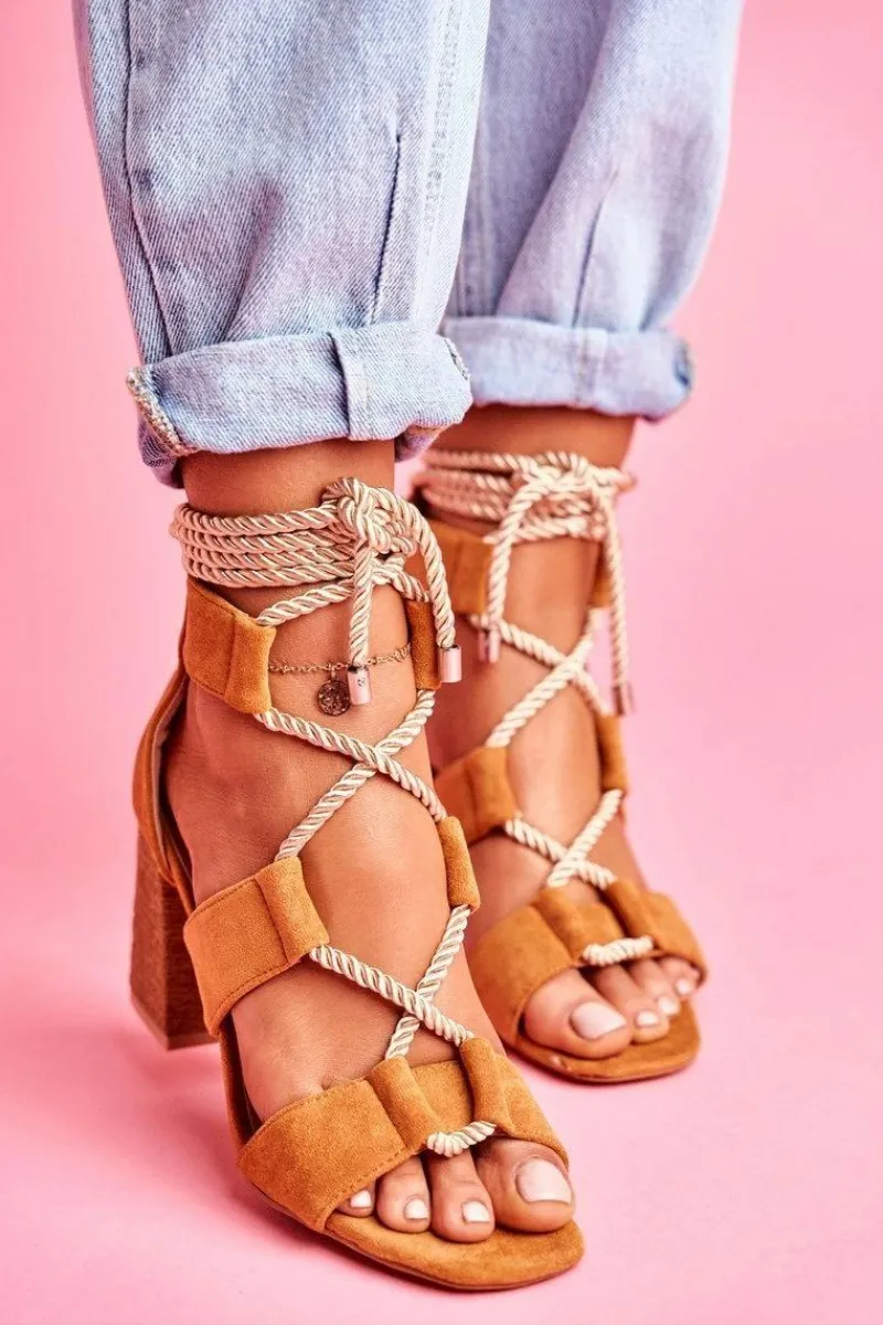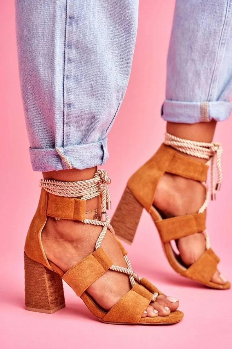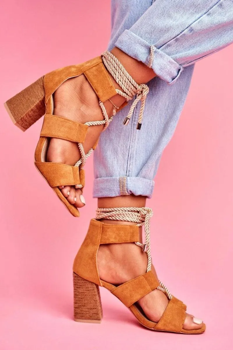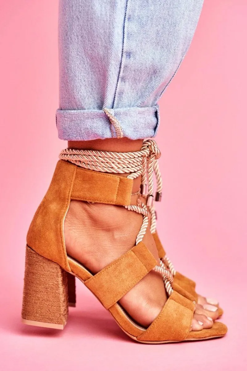 Sandały Na Obcasie>Boto Sandały Damskie Na Słupku Wiązane Zamszowe Camel Amore