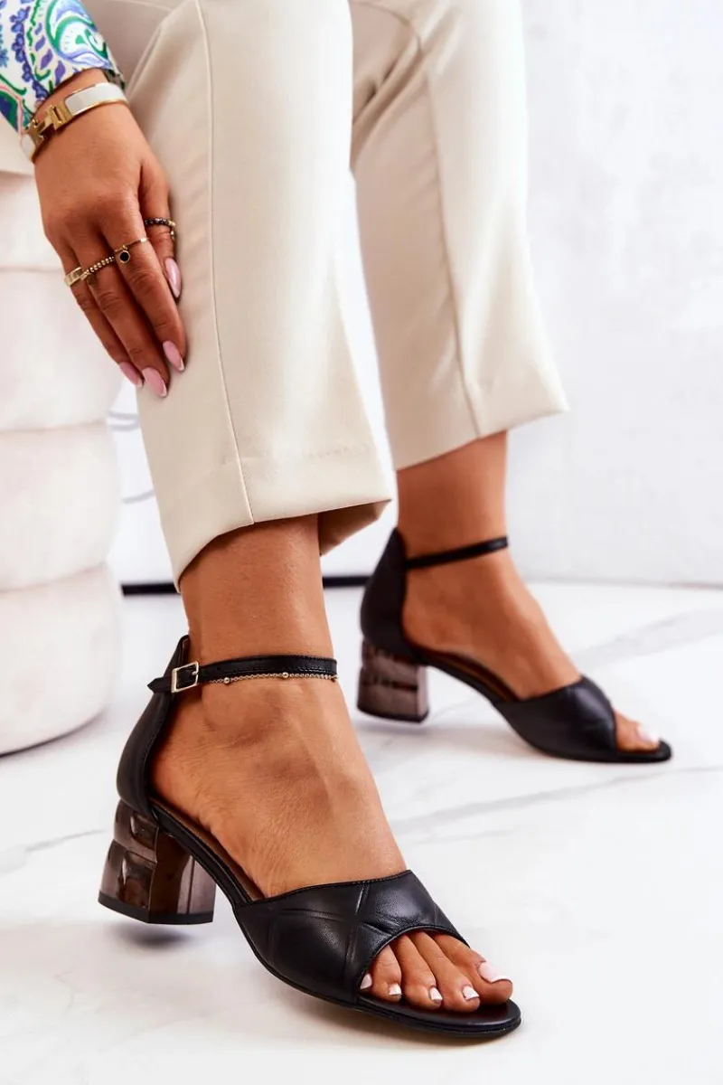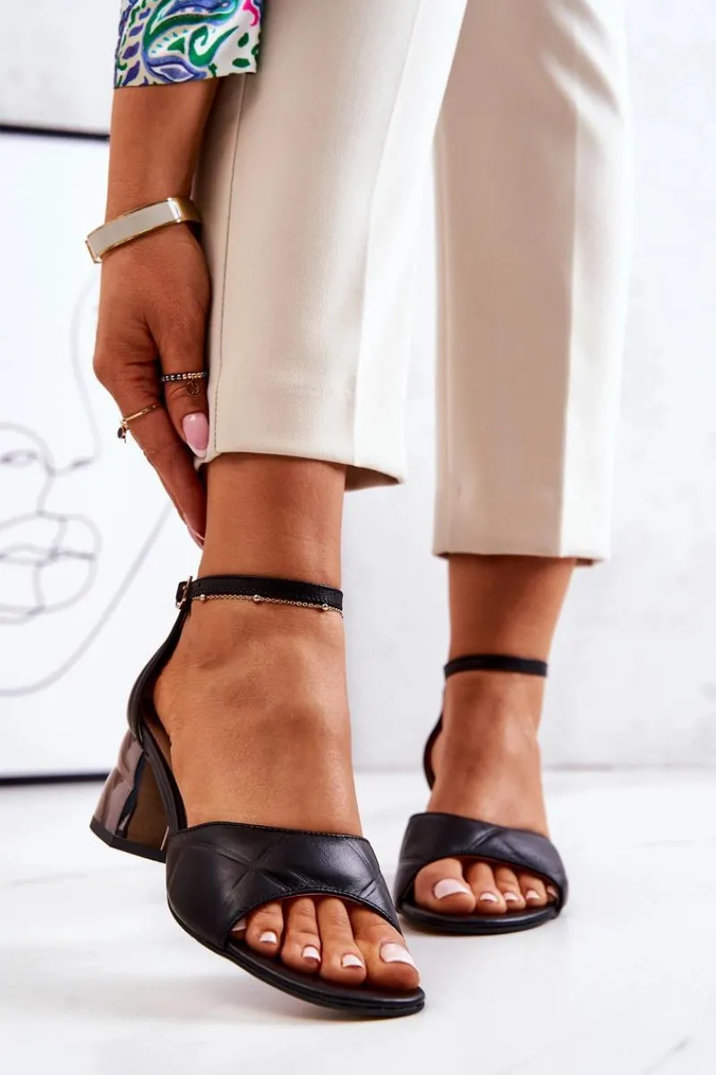 Wygodne sandały to marzenie każdej kobiety! Lustrzany oraz stabilny słupek zapewni Ci gustowny wygląd oraz wygodę. Skórzany, przeszywany materiał z pewnością sprawi, że zostaniesz zauważona! Sandałki są zapinane na regulowany pasek ze sprzączką. Już dziś wybierz ofertę naszą ofertę i kup teraz w doskonale niskiej cenie! Przy wyborze rozmiaru prosimy kierować tabelą rozmiarów.
