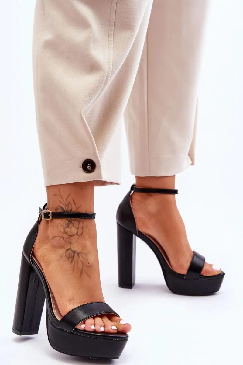 Damskie sandałki zostały wykonane z eko skóry. Model ten posiada na przodzie pasek przytrzymujący stopę przed przesuwaniem. Sandałki osadzono na obcasie w postaci wysokiego słupka oraz platformie. Dodatkowo sandałki posiadają usztywniany zapiętek. Model ten jest zapinany na regulowany pasek ze sprzączką. Przy wyborze rozmiaru prosimy sugerować się tabelą rozmiarów.