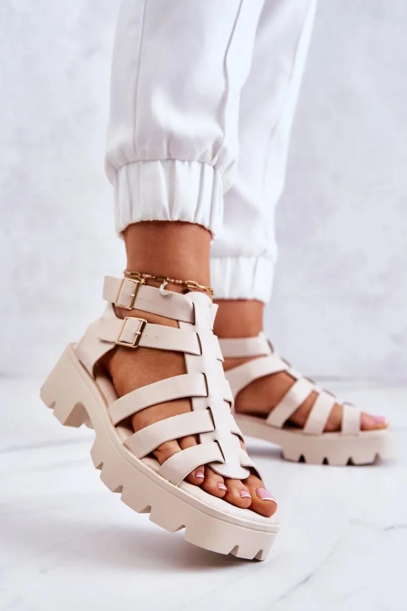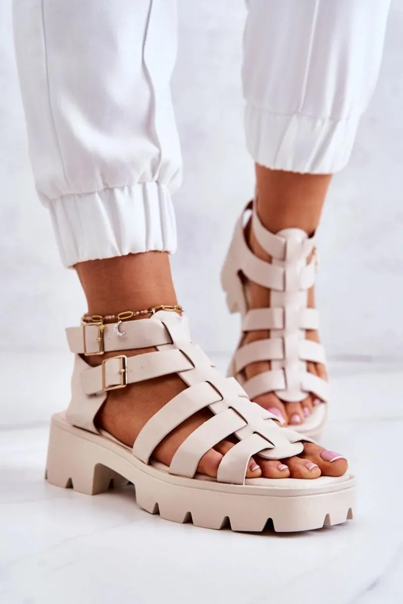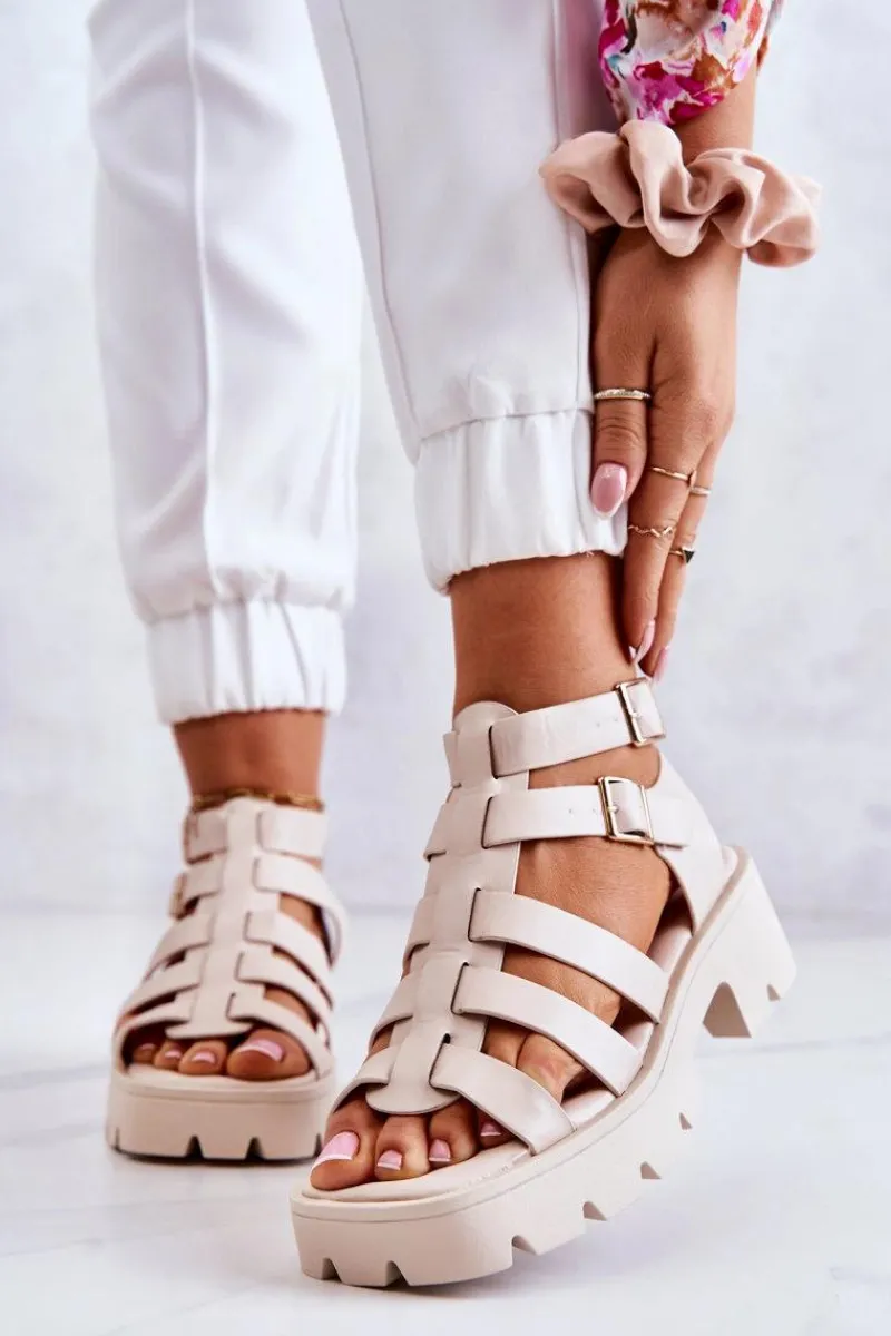 Przewiewne sandały wykonane z eko skóry. Paseczki świetnie podtrzymują stopę. Zapinane na regulowane paski ze sprzączką. Sandałki posiadają odkryty, kwadratowy nosek oraz odkrytą piętę. Miękka, eko skórzana wkładka zapewni wygodę podczas użytkowania. Płaski, masywny obcas oraz platforma sprawiają, że buty są niezwykle stabilne. Te sandałki to idealny fason na upalne dni. Świetnie będą prezentować się z zarówno ze spodniami, jak i sukienkami. Przy wyborze rozmiaru prosimy sugerować się tabelą rozmiarów.