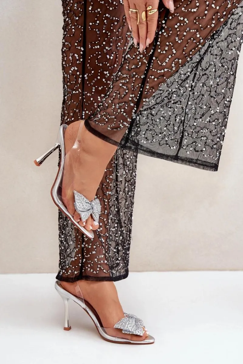 Eleganckie transparentne sandały na szpilce, które idealnie podkreślą wyjątkowy charakter Twojej stylizacji. Model wyróżnia się efektowną, błyszczącą kokardą z przodu, dodającą odrobinę glamour. Model ten doskonale komponują się z sukniami koktajlowymi oraz eleganckimi kompletami, tworząc szykowny i modny look. Przy wyborze rozmiaru prosimy sugerować się tabelą rozmiarów.