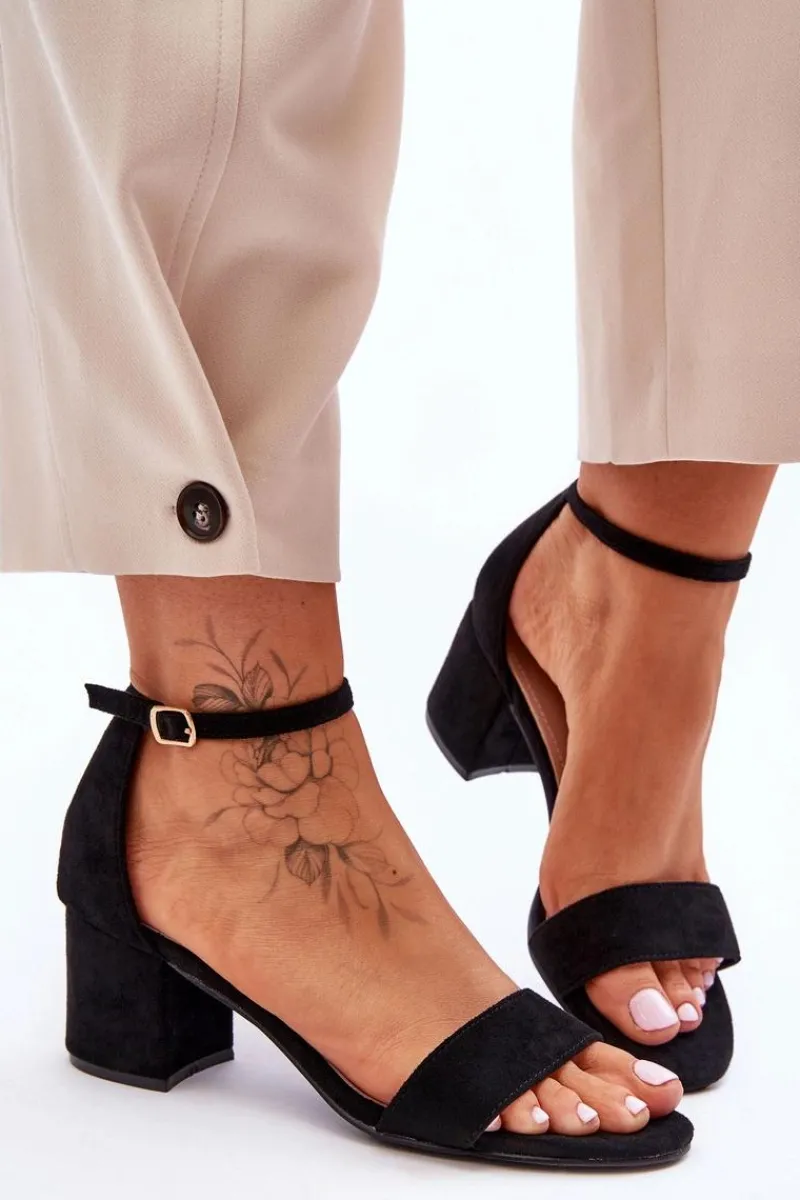 Klasyczne sandałki na niewysokim obcasie w postaci stabilnego słupka zostały wykonane z przyjemnego w dotyku eko zamszu. Sandałki te posiadają usztywniany zapiętek. Wkładka została wykonana z eko skóry i zapewni komfort podczas użytkowania obuwia. Nosek odkryty, zaokrąglony. Zapinane wokół kostki na regulowany pasek ze sprzączką. Na pewno wykorzystasz je w wielu sytuacjach! Przy wyborze rozmiaru prosimy sugerować się tabelą rozmiarów.