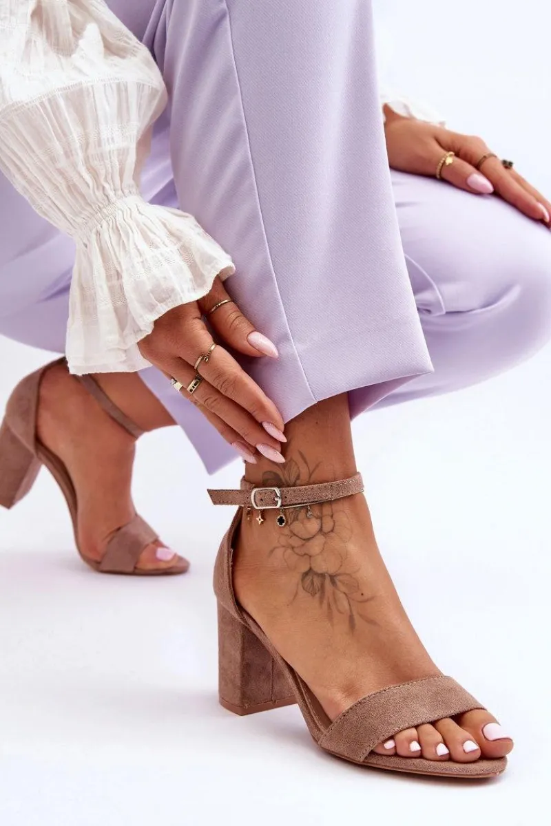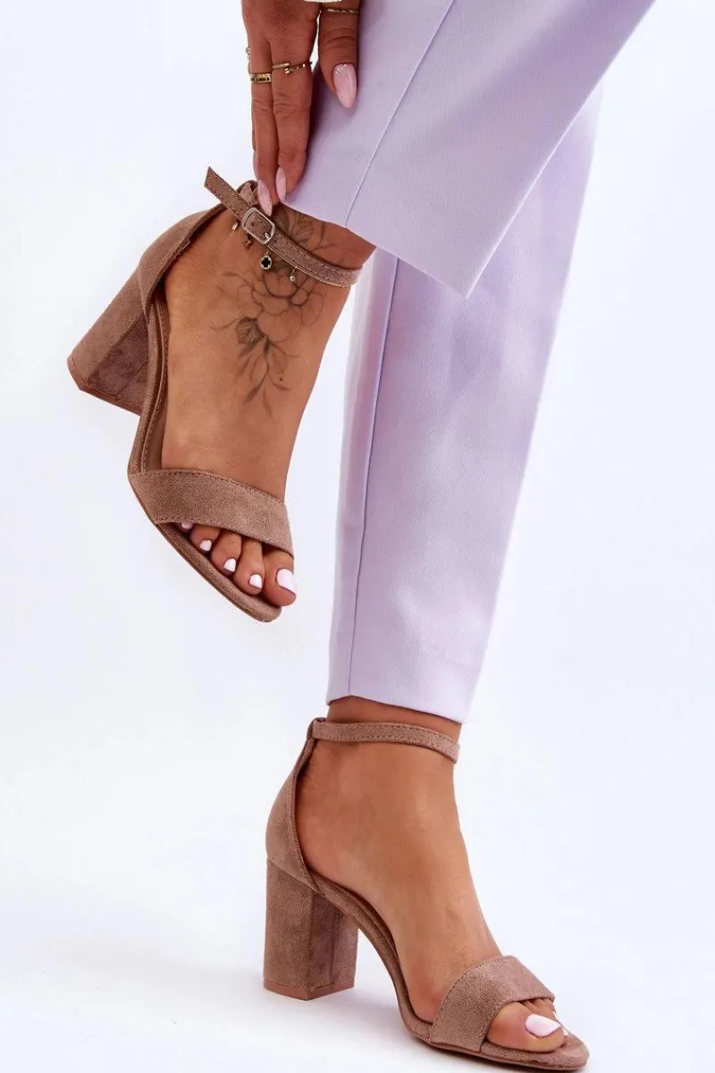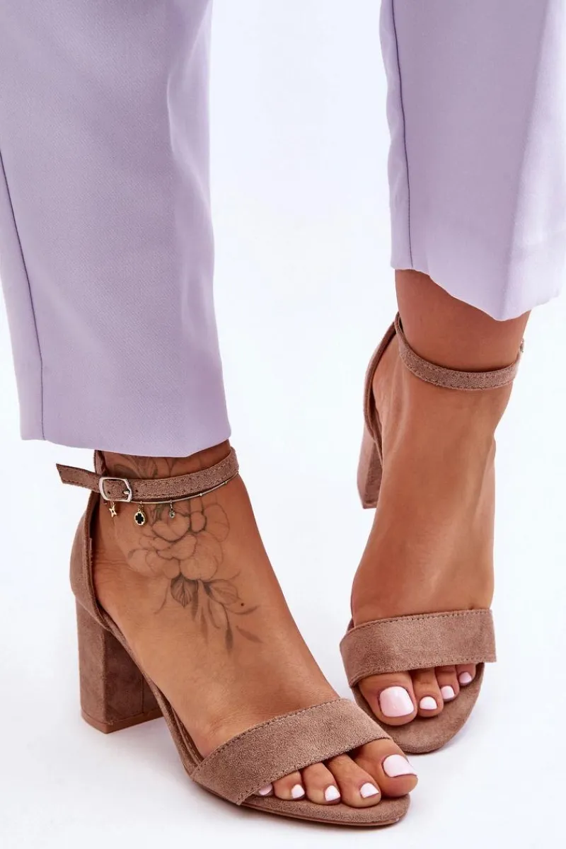 Klasyczne sandałki damskie osadzono na obcasie w postaci stabilnego słupka. Buty te zostały wykonane z eko zamszu. Nosek jest odkryty, zaokrąglony. Miękka wkładka z eko skóry zapewni komfort podczas użytkowania. Buty posiadają regulowany pasek zapinany na sprzączkę wokół kostki. Model ten wykorzystasz w wielu stylizacjach. Dodatkowo zapiętek został delikatnie usztywniony. Przy wyborze rozmiaru prosimy sugerować się tabelą rozmiarów.