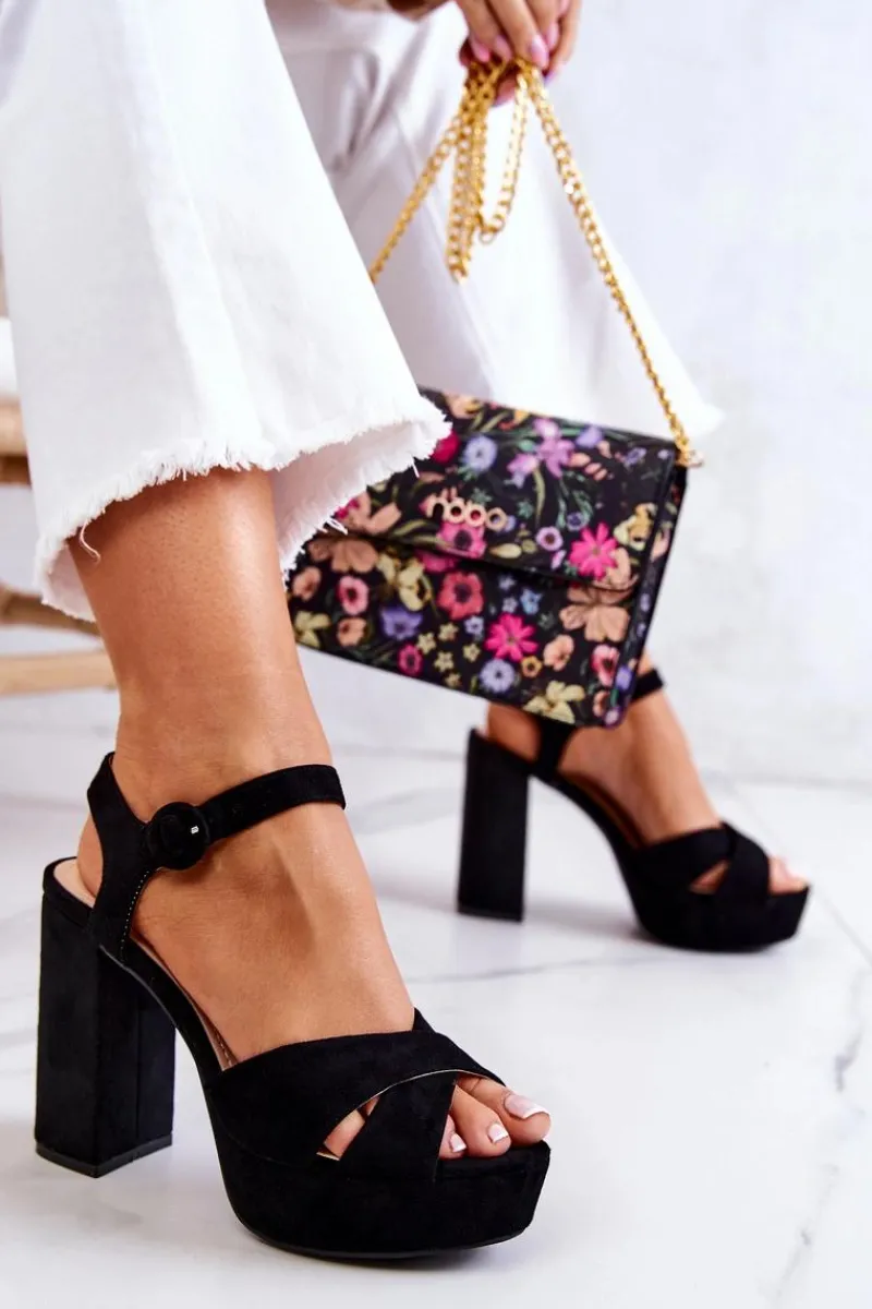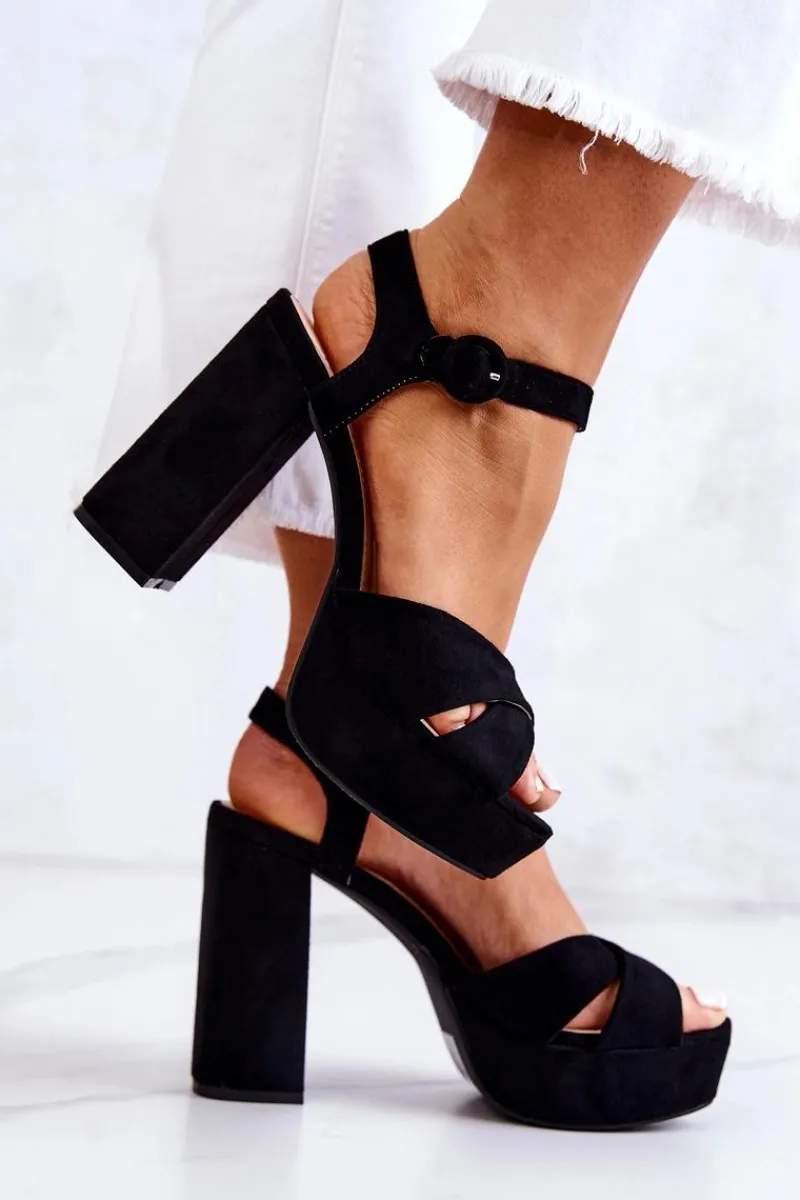 Świetne sandałki wykonane z zamszowej eko skóry. Posiadają wysoki obcas w postaci słupka oraz platformę. Regulowany pasek zapinany na sprzączkę. Idealny model na różnego rodzaju okazje! Sandałki posiadają eko skórzaną, miękką wkładkę. Koniecznie musisz je mieć! Przy wyborze rozmiaru prosimy kierować tabelą rozmiarów.
