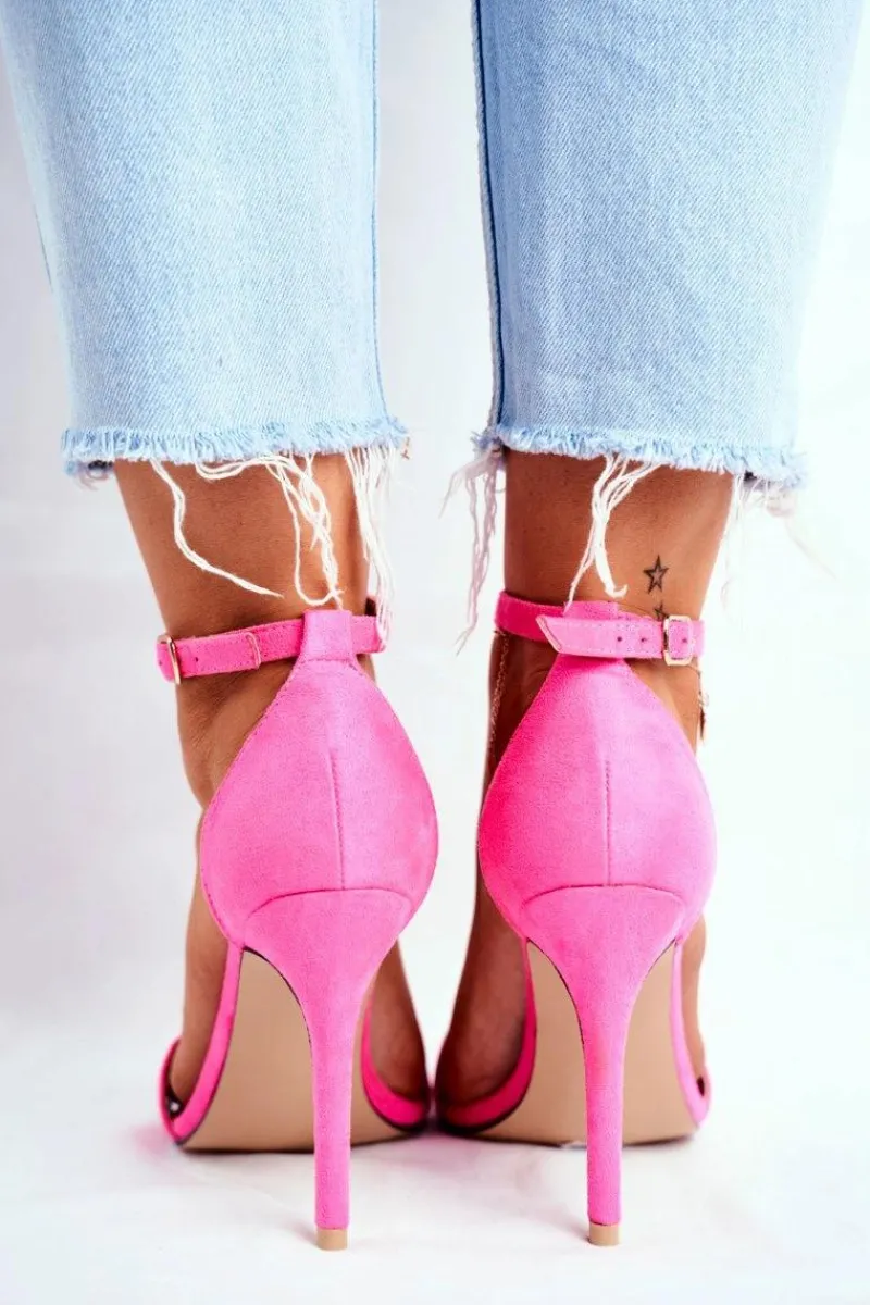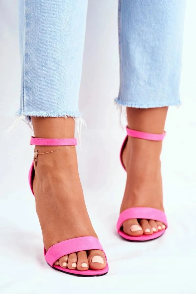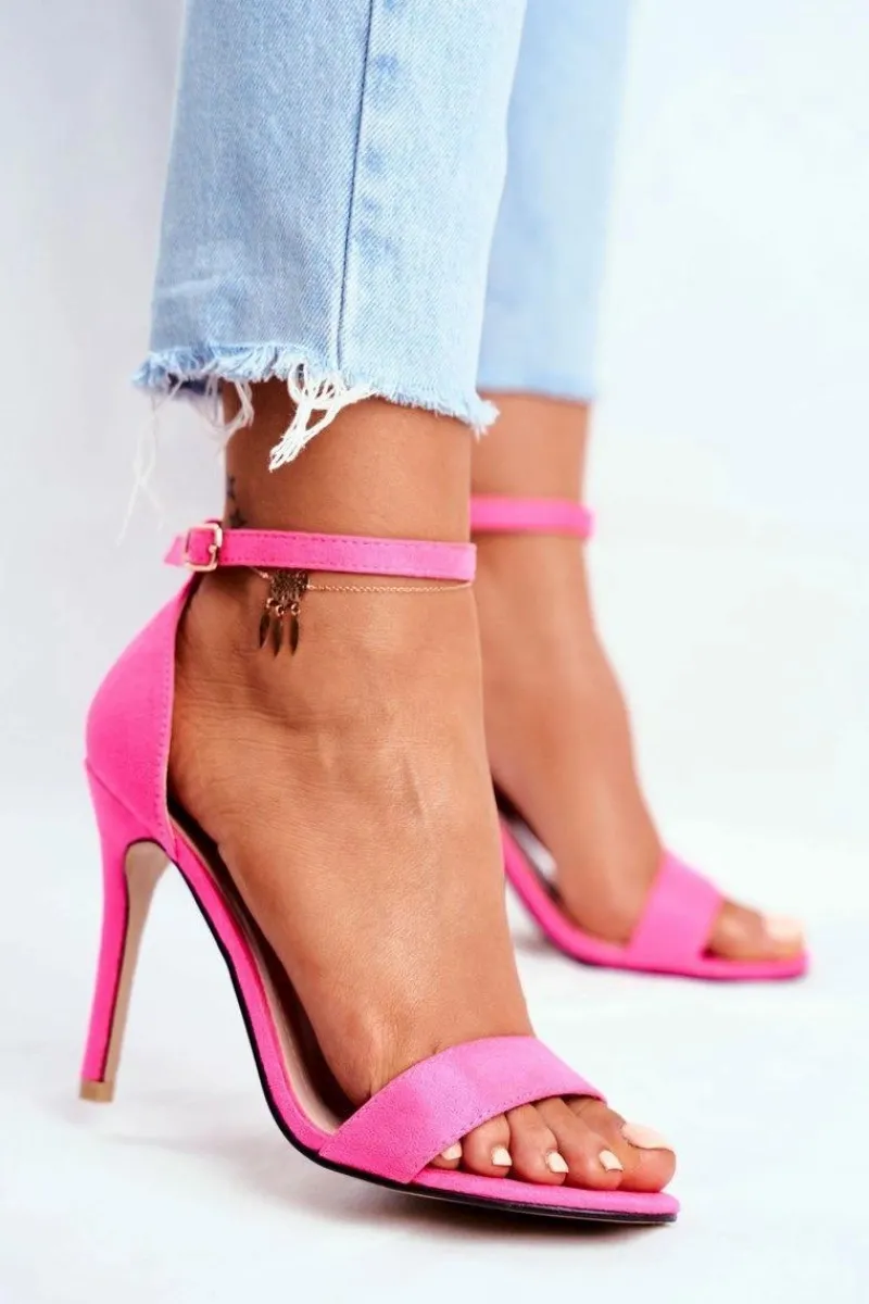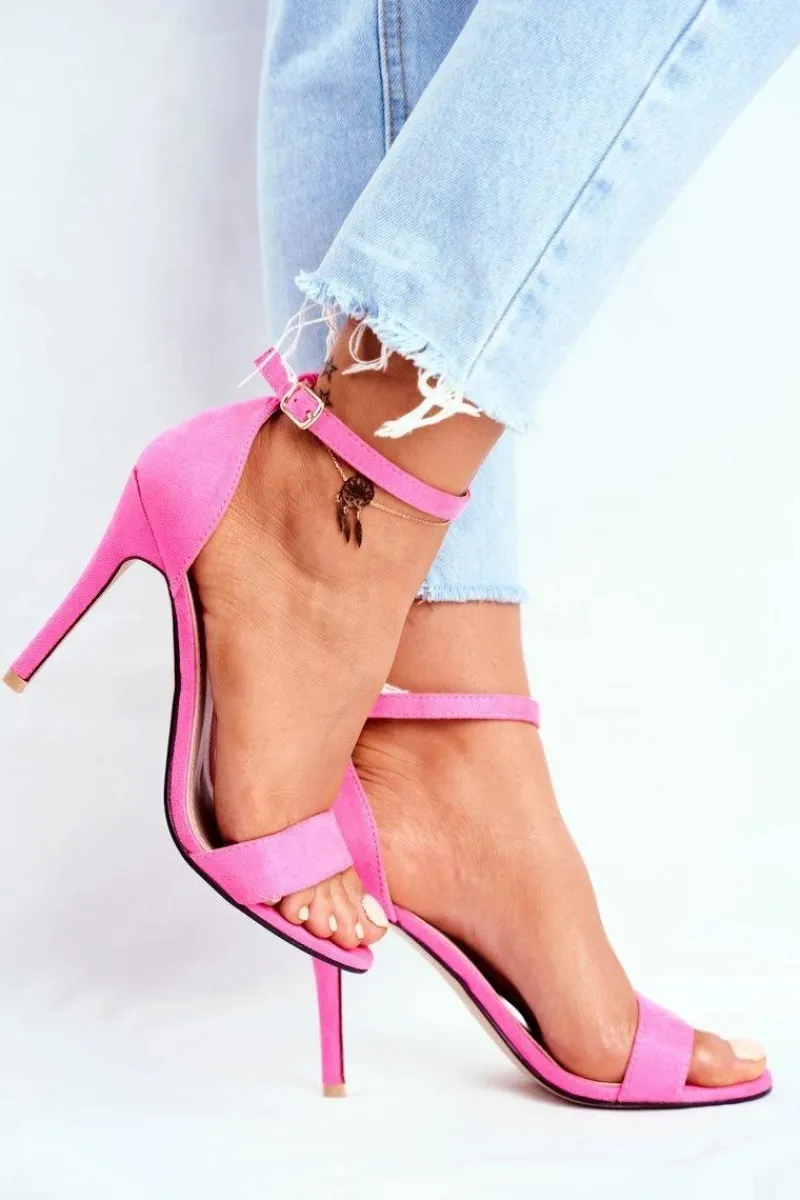 Klasyczne sandały na szpilce wykonane z eko zamszu. Przy wyborze rozmiaru prosimy sugerować się tabelą rozmiarów.