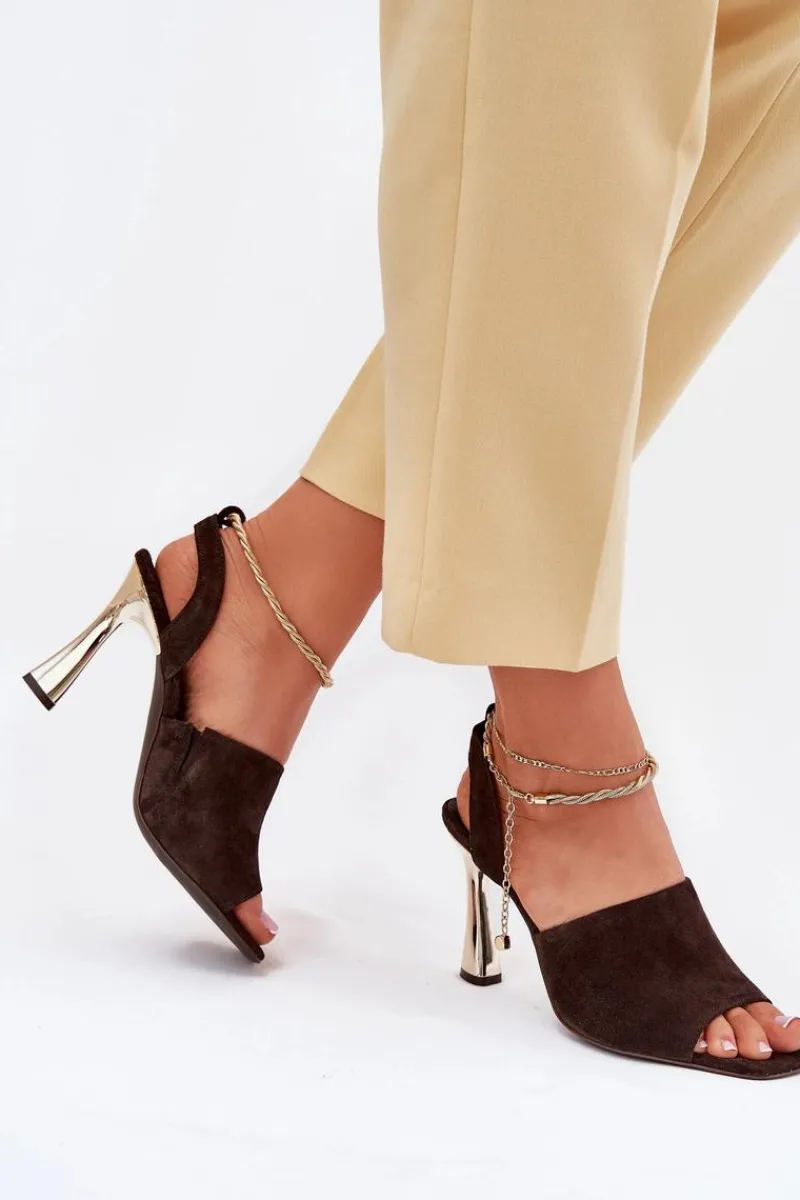Sandały damskie od marki CheBello wykonane z wysokiej jakości naturalnego zamszu. Osadzone na smukłej szpilce, z subtelną bransoletą wokół kostki, dodającą elegancji i szyku. Idealne na wyjątkowe okazje oraz wieczorne wyjścia, łączą w sobie styl, klasę i komfort noszenia. Przy wyborze rozmiaru prosimy sugerować się tabelą rozmiarów.