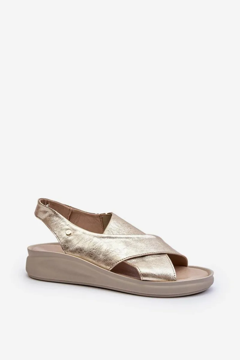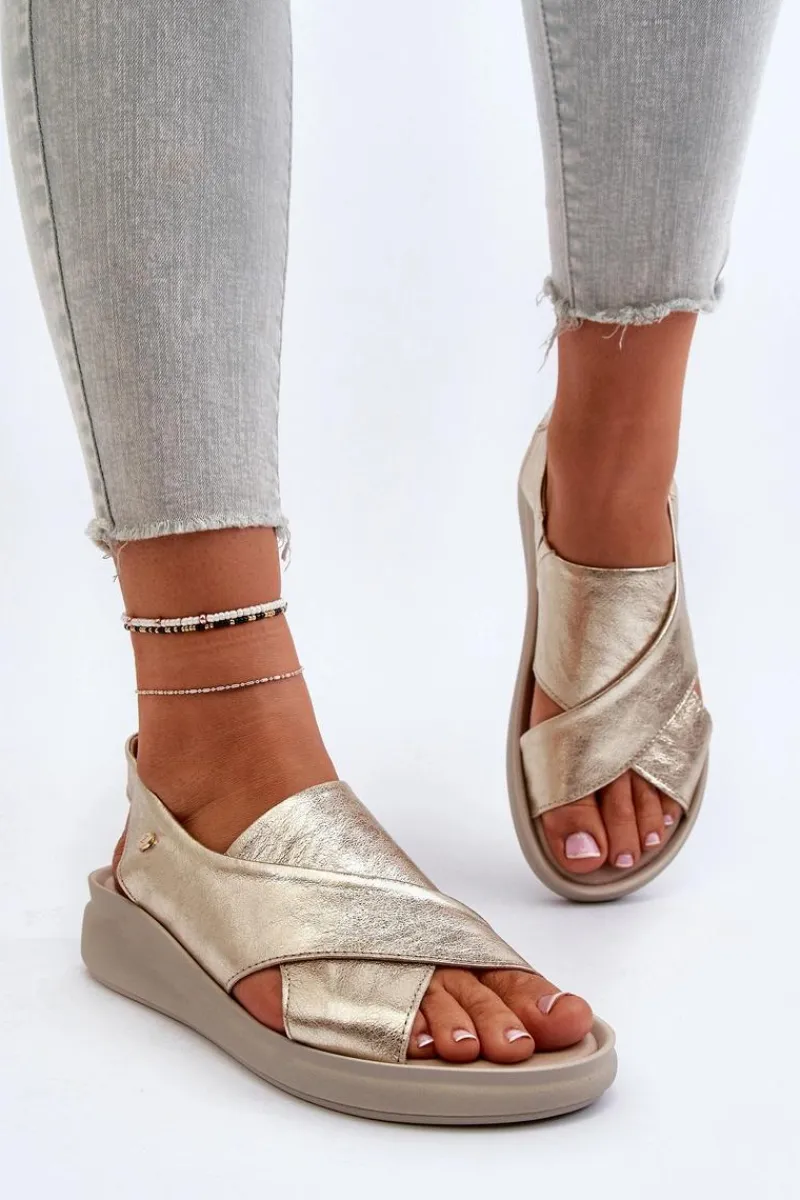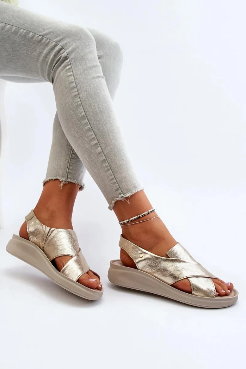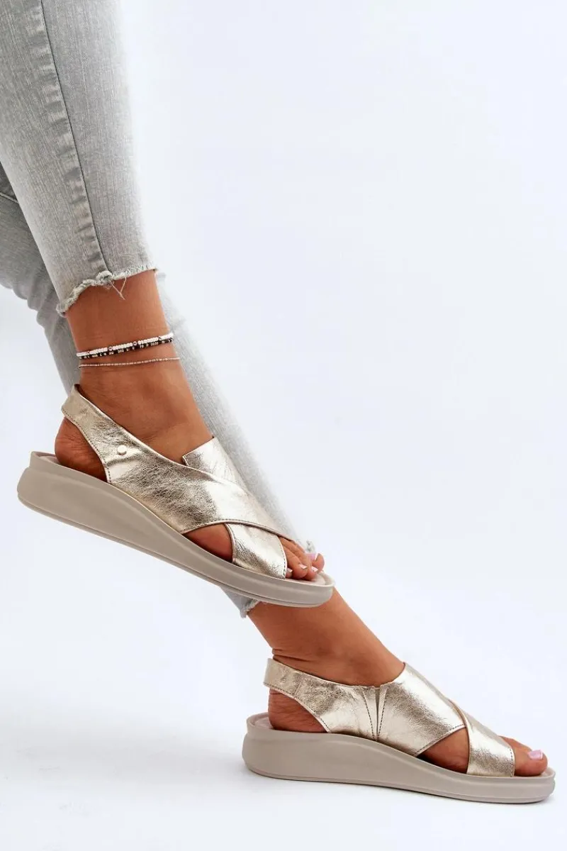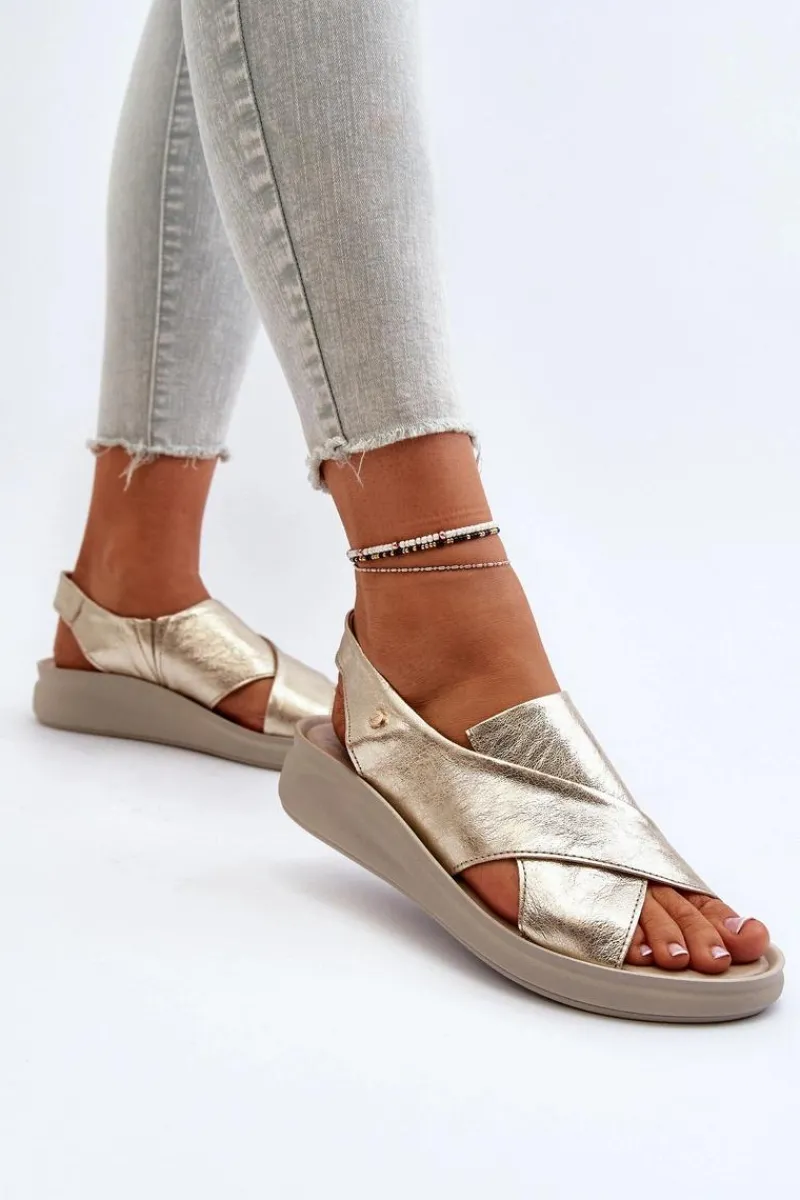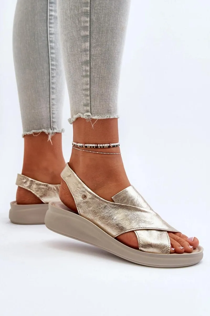 Te sandałki damskie to połączenie wygody i stylu, które z pewnością przypadnie Ci do gustu! Wykonane z naturalnej skóry, zapewniają trwałość i komfort noszenia. Model wsuwany, z dodatkową gumką. Ozdobny emblemat z boku cholewki dodaje im wyjątkowego charakteru, nadając im subtelny, elegancki akcent. Sandały zostały osadzone na platformie oraz lekkim koturnie, co nie tylko dodaje im stylowego wyglądu, ale także zapewnia stabilność i komfort podczas chodzenia. Model ten jest niezwykle praktycznym i modnym dodatkiem do letniej garderoby, idealnym zarówno na codzienne spacery, jak i na bardziej formalne okazje. Przy wyborze rozmiaru prosimy kierować się tabelą rozmiarów.