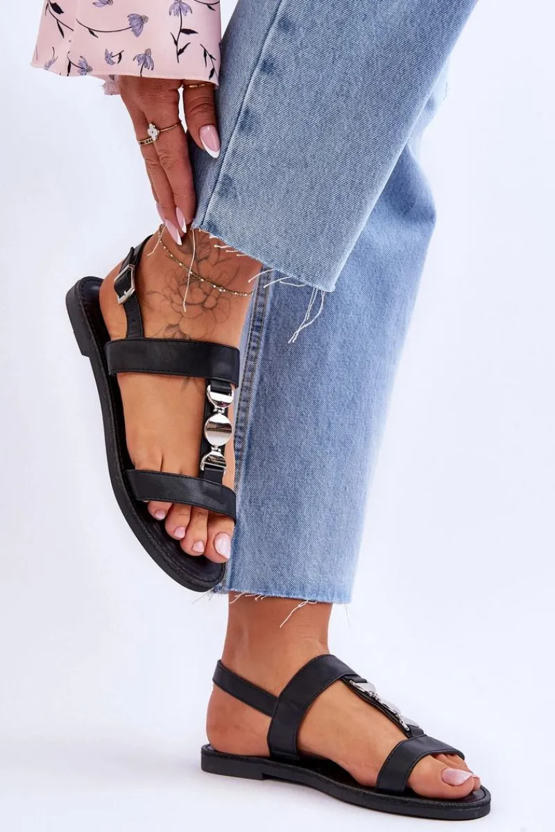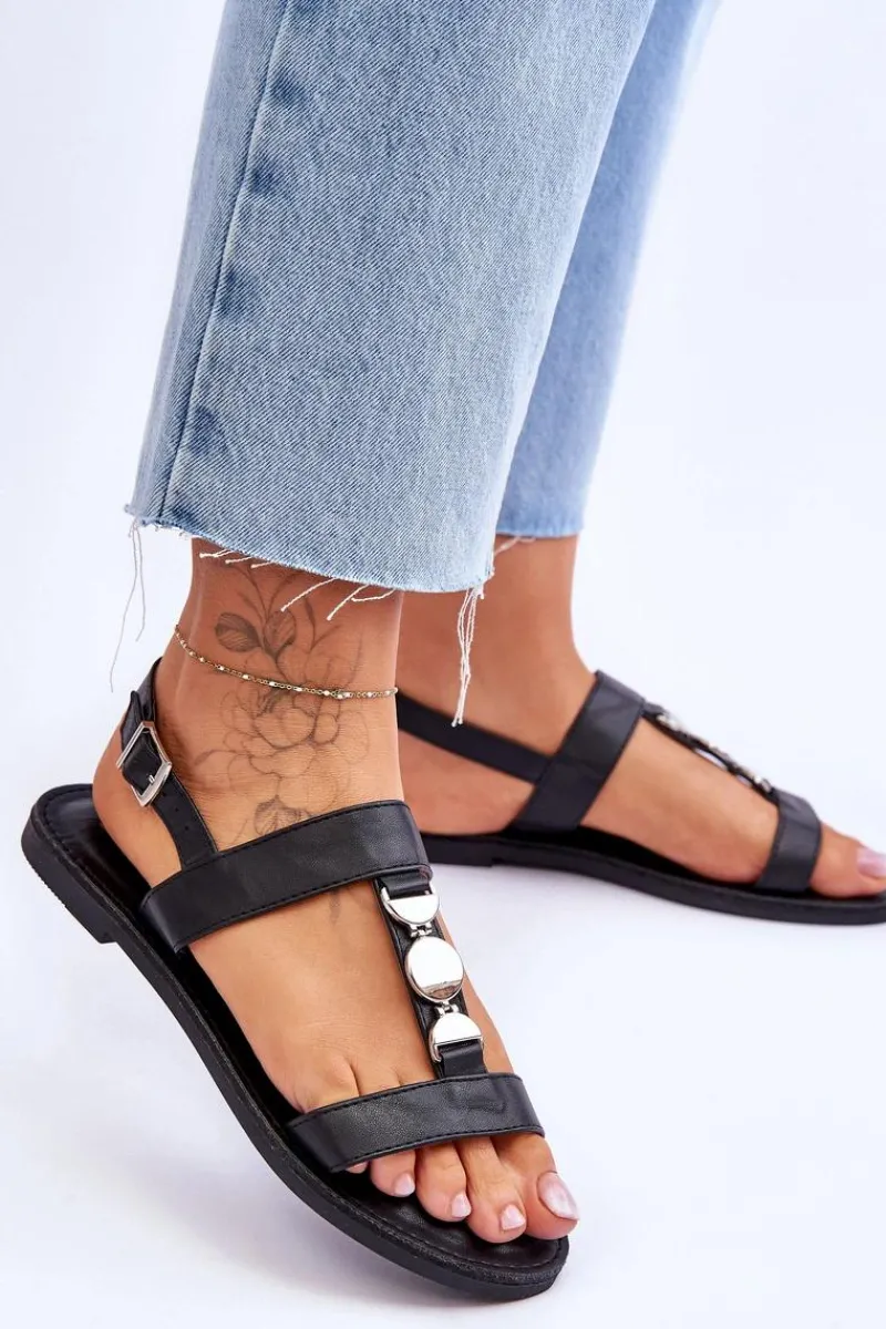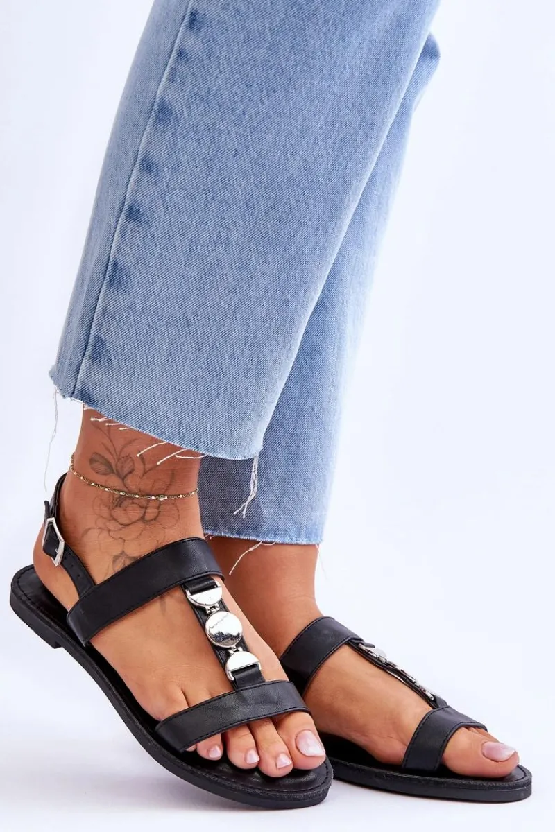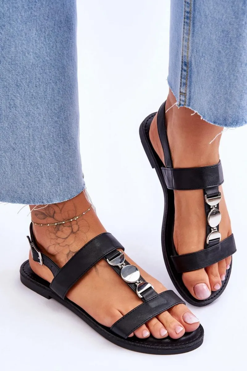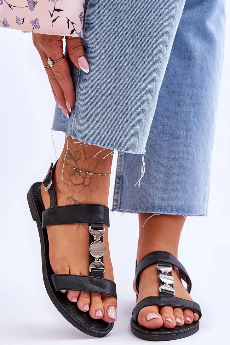 Damskie sandałki zostały wykonane z eko skóry. Model ten posiada zdobienie na paseczku w postaci kół. Sandałki są zapinane na regulowany pasek ze sprzączką. Wygodna wkładka z eko skóry zapewni komfort podczas użytkowania obuwia. Sandałki osadzono na płaskim obcasie z antypoślizgową podeszwą. Przy wyborze rozmiaru prosimy kierować się tabelą rozmiarów.