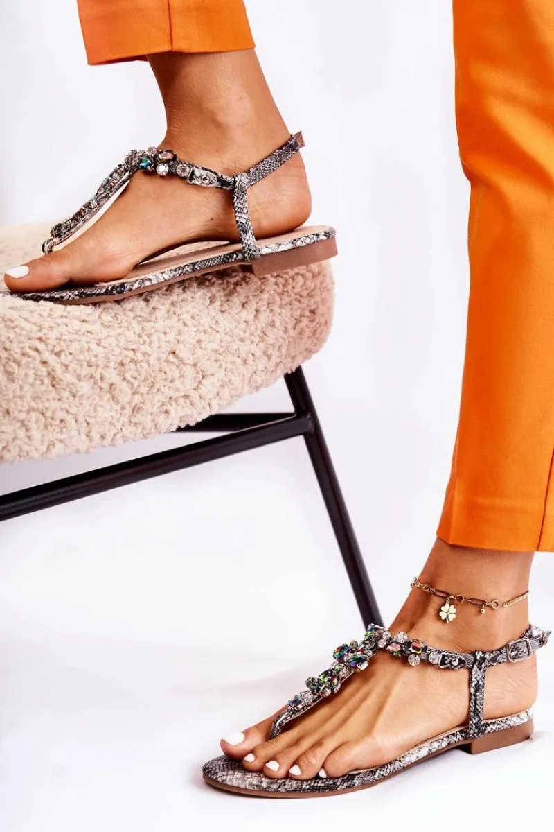 Sandały typu japonki na płaskim obcasie. Posiadają otwarty, zaokrąglony nosek. Cienkie paski zostały wykonane z eko skóry. Model zapinany na sprzączkę z regulowanym paskiem, dzięki któremu możesz je odpowiednio dopasować do tęgości nogi. Ozdobione dżetami na paskach imitującymi cyrkonie i kryształy. Miękka wkładka wykonana także z eko skóry. Sandały świetnie będą prezentować się z wieloma stylizacjami! Przy wyborze rozmiaru prosimy kierować się tabelą rozmiarów.