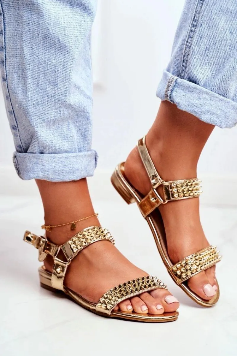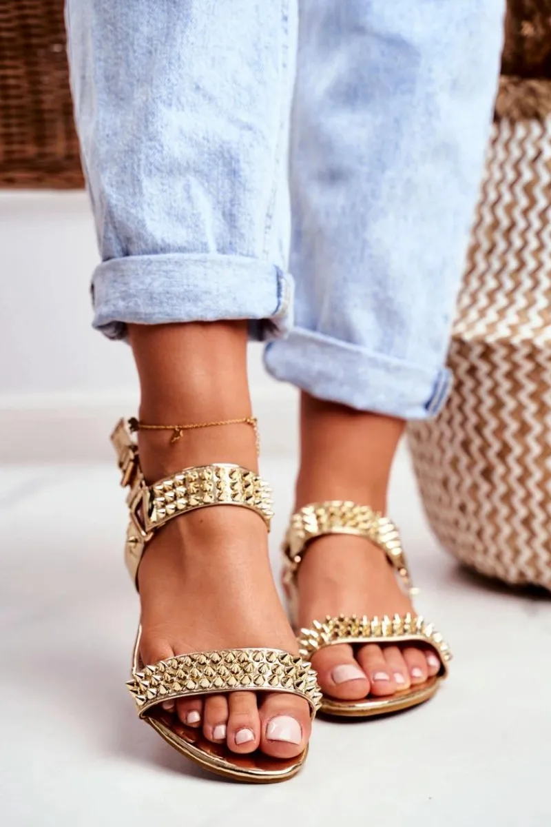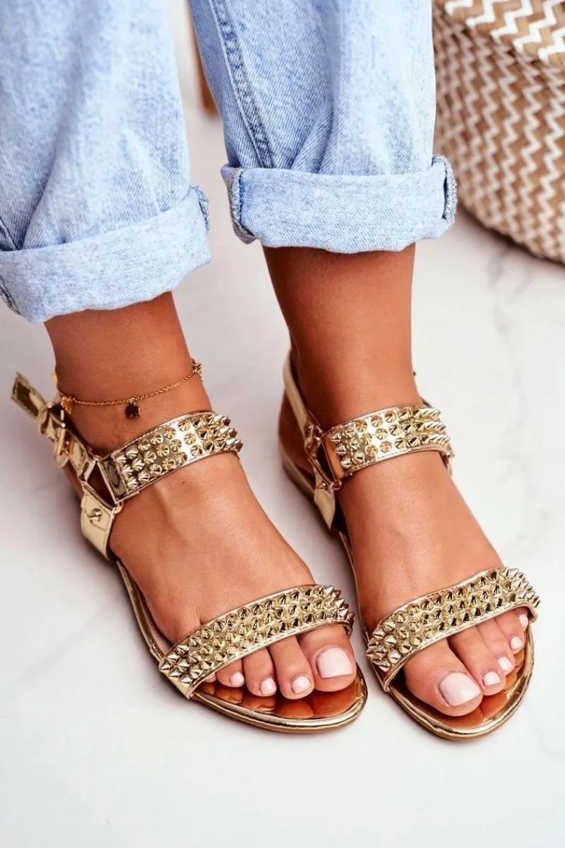 Sandały Płaskie>Boto Złote Damskie Płaskie Sandałki Lu Boo Z Ćwiekami Aldona