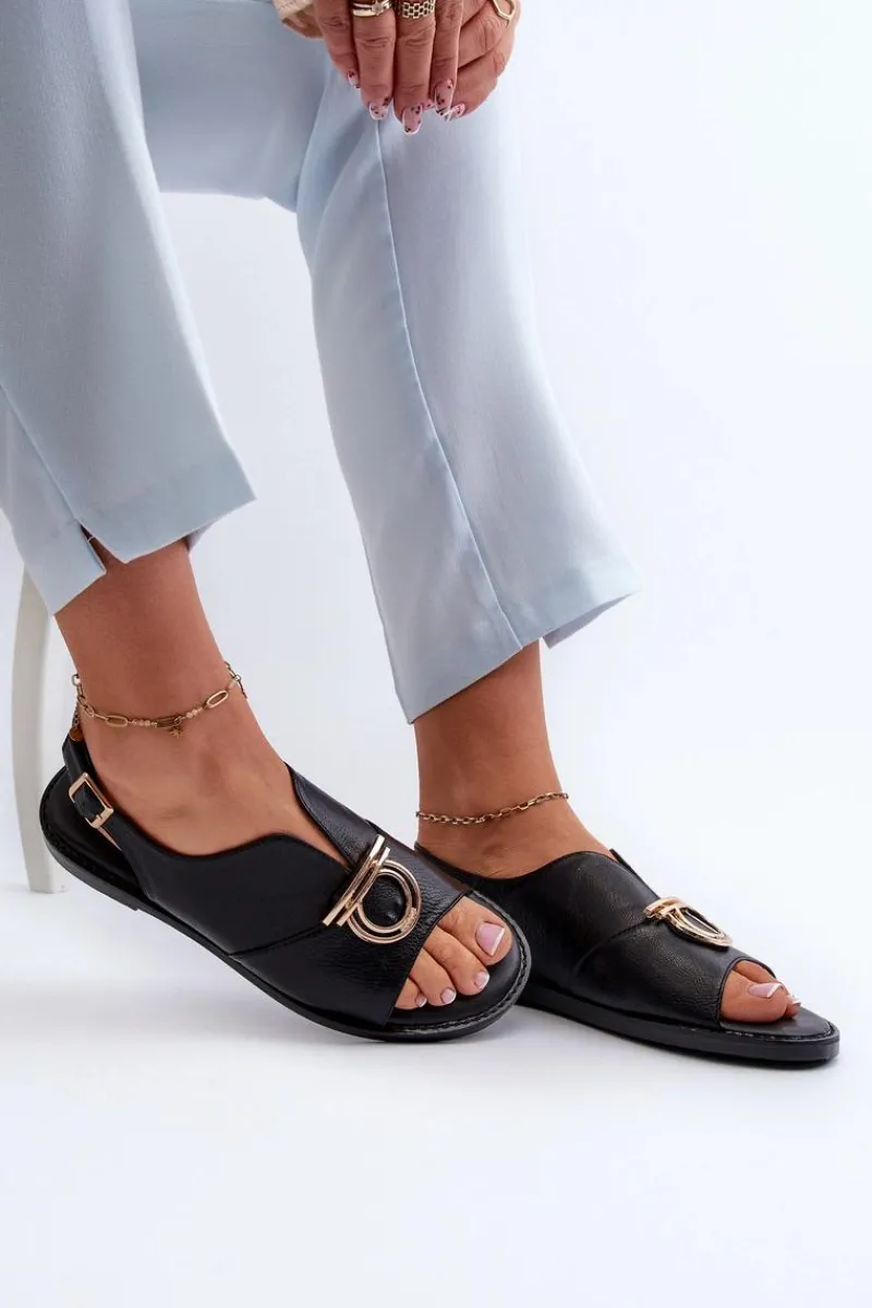 Sandały damskie płaskie to idealne połączenie stylu i wygody. Wykonane z wysokiej jakości eko skóry. Złota ozdoba dodaje im elegancji i wyjątkowego charakteru. Zapinane na regulowany pasek ze sprzączką, gwarantują idealne dopasowanie do stopy. Przy wyborze rozmiaru prosimy sugerować się tabelą rozmiarów.