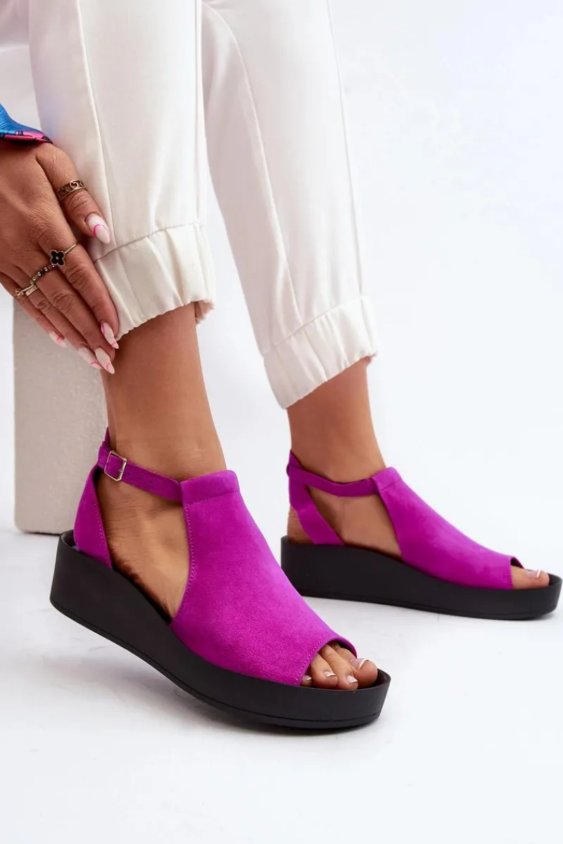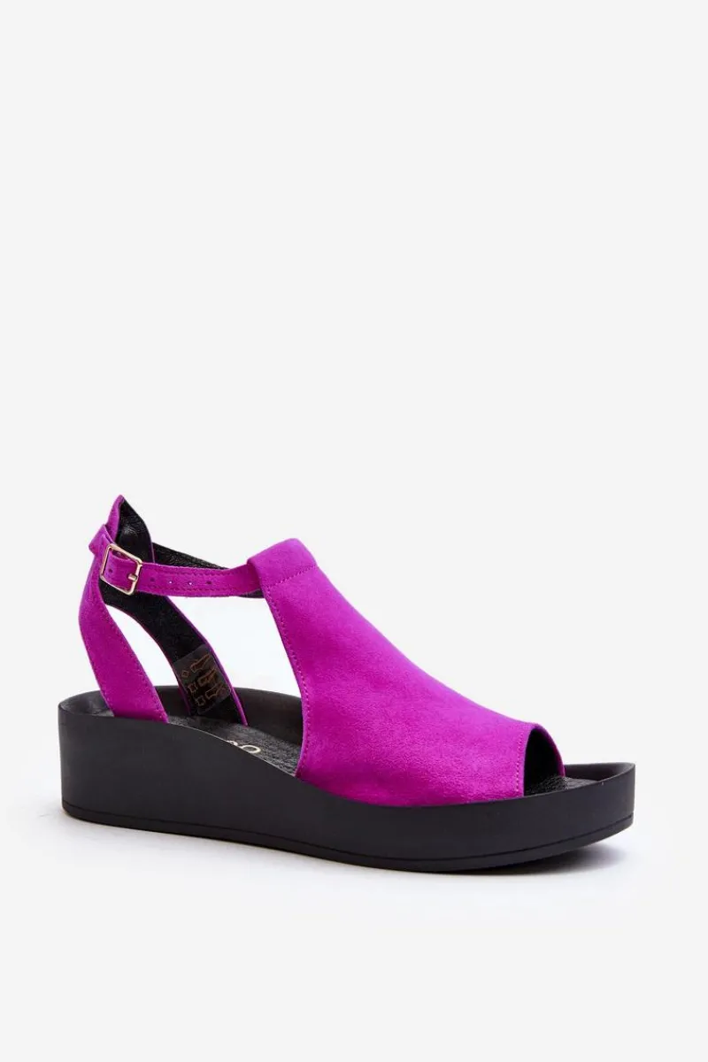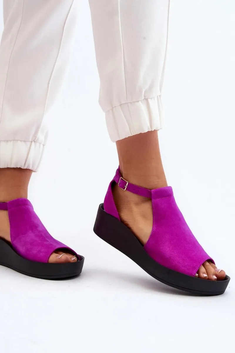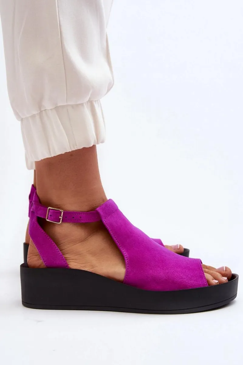 Wygodne sandały damskie to idealny wybór na letnie dni! Wykonane z naturalnego zamszu. Osadzone na platformie oraz delikatnym koturnie. Zapinane na regulowany pasek ze sprzączką. Miękka wkładka ze skóry naturalnej zapewni komfort podczas użytkowania obuwia. Idealne do każdej letniej stylizacji! Przy wyborze rozmiaru prosimy kierować się tabelą rozmiarów.