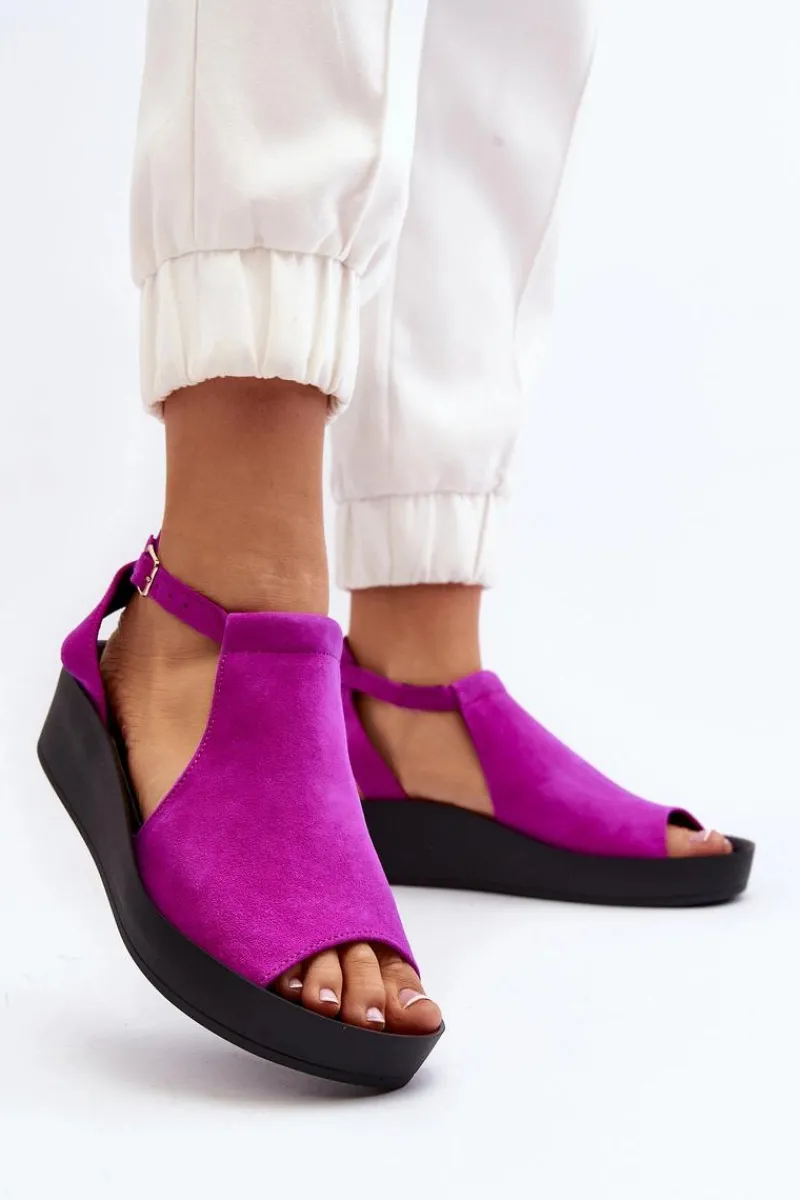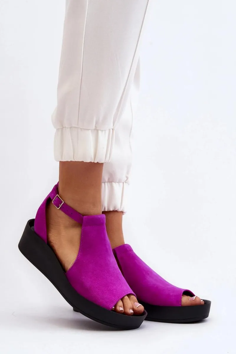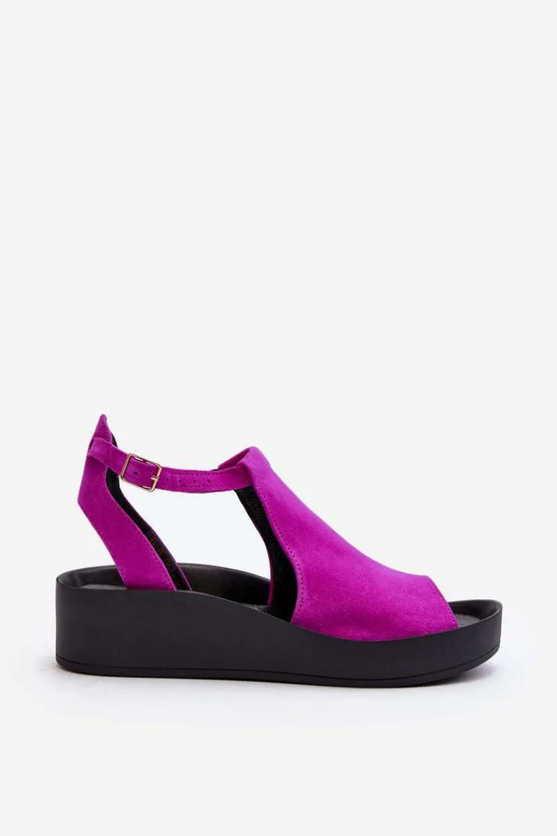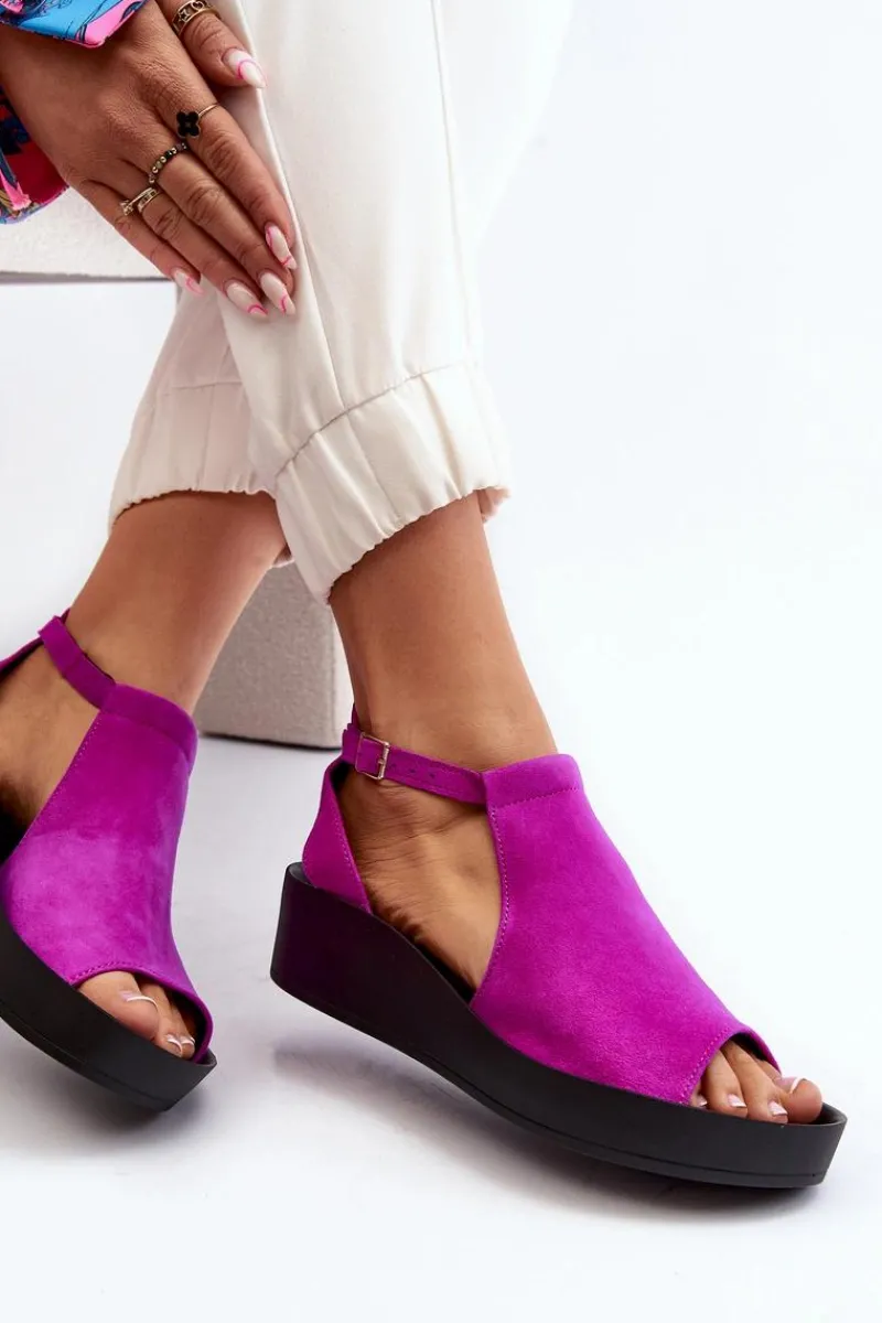 Wygodne sandały damskie to idealny wybór na letnie dni! Wykonane z naturalnego zamszu. Osadzone na platformie oraz delikatnym koturnie. Zapinane na regulowany pasek ze sprzączką. Miękka wkładka ze skóry naturalnej zapewni komfort podczas użytkowania obuwia. Idealne do każdej letniej stylizacji! Przy wyborze rozmiaru prosimy kierować się tabelą rozmiarów.