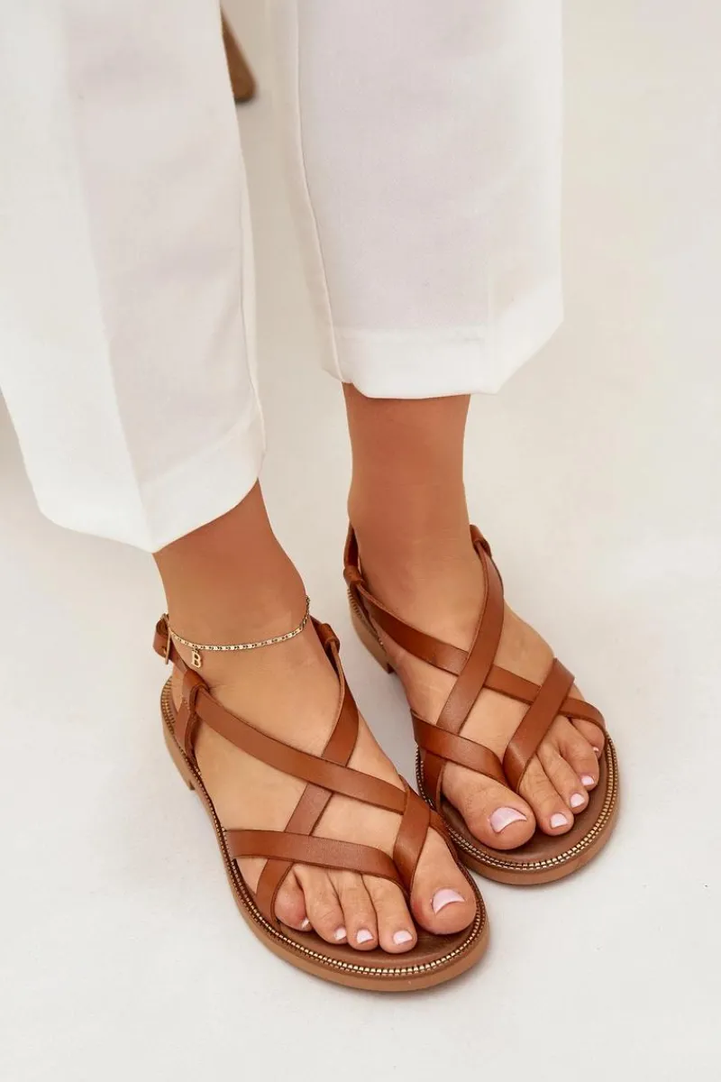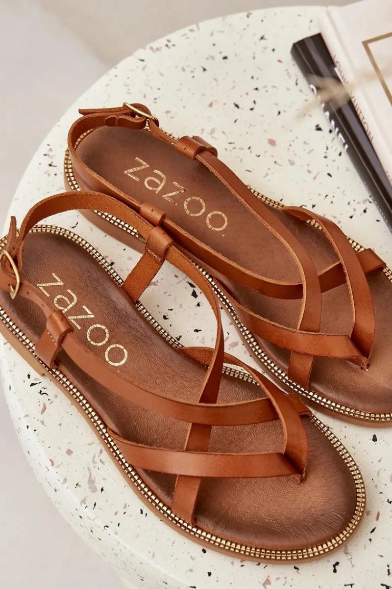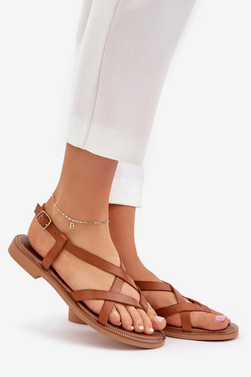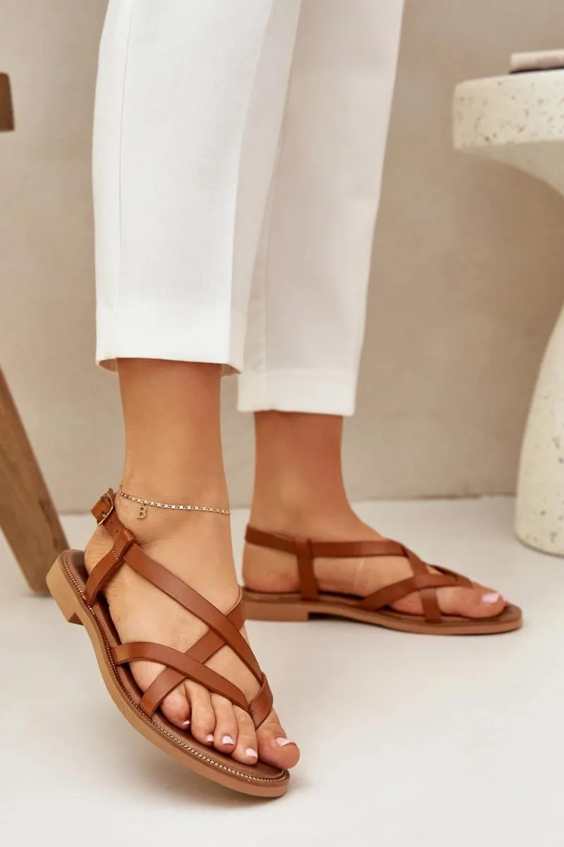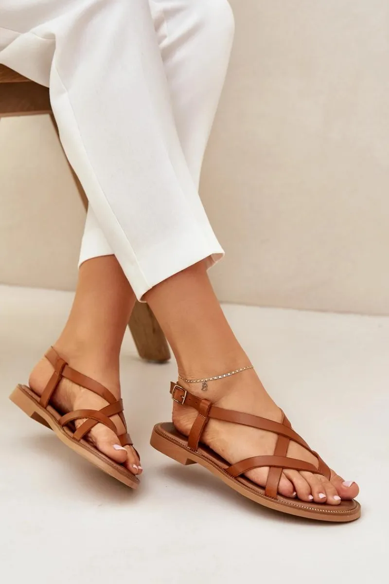 Płaskie sandały wykonane z naturalnej skóry to elegancka propozycja na ciepłe dni. Zapinane na regulowany pasek ze sprzączką, co pozwala na idealne dopasowanie do stopy. Przeplatające się paski nadają im subtelny, ale jednocześnie nowoczesny wygląd. Te sandały łączą wygodę z modnym designem, sprawdzając się doskonale zarówno na co dzień, jak i w bardziej eleganckich stylizacjach. Przy wyborze rozmiaru prosimy kierować się tabelą rozmiarów.