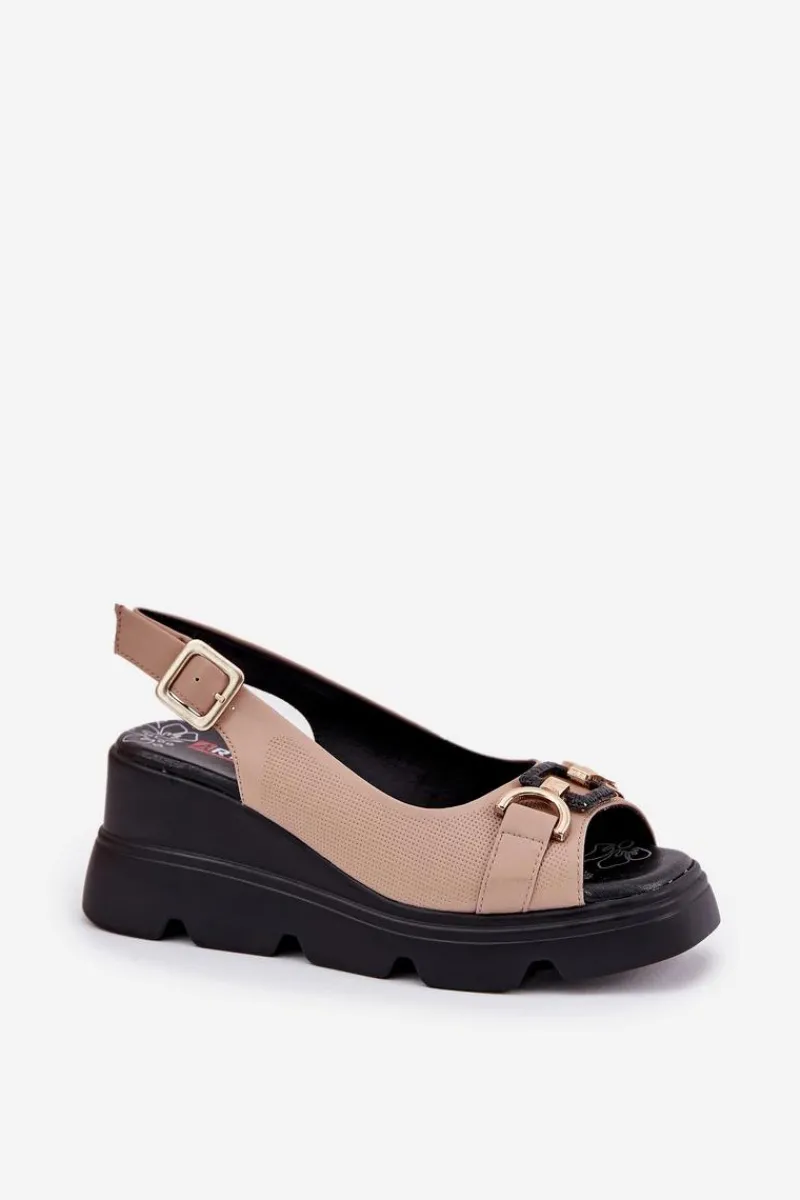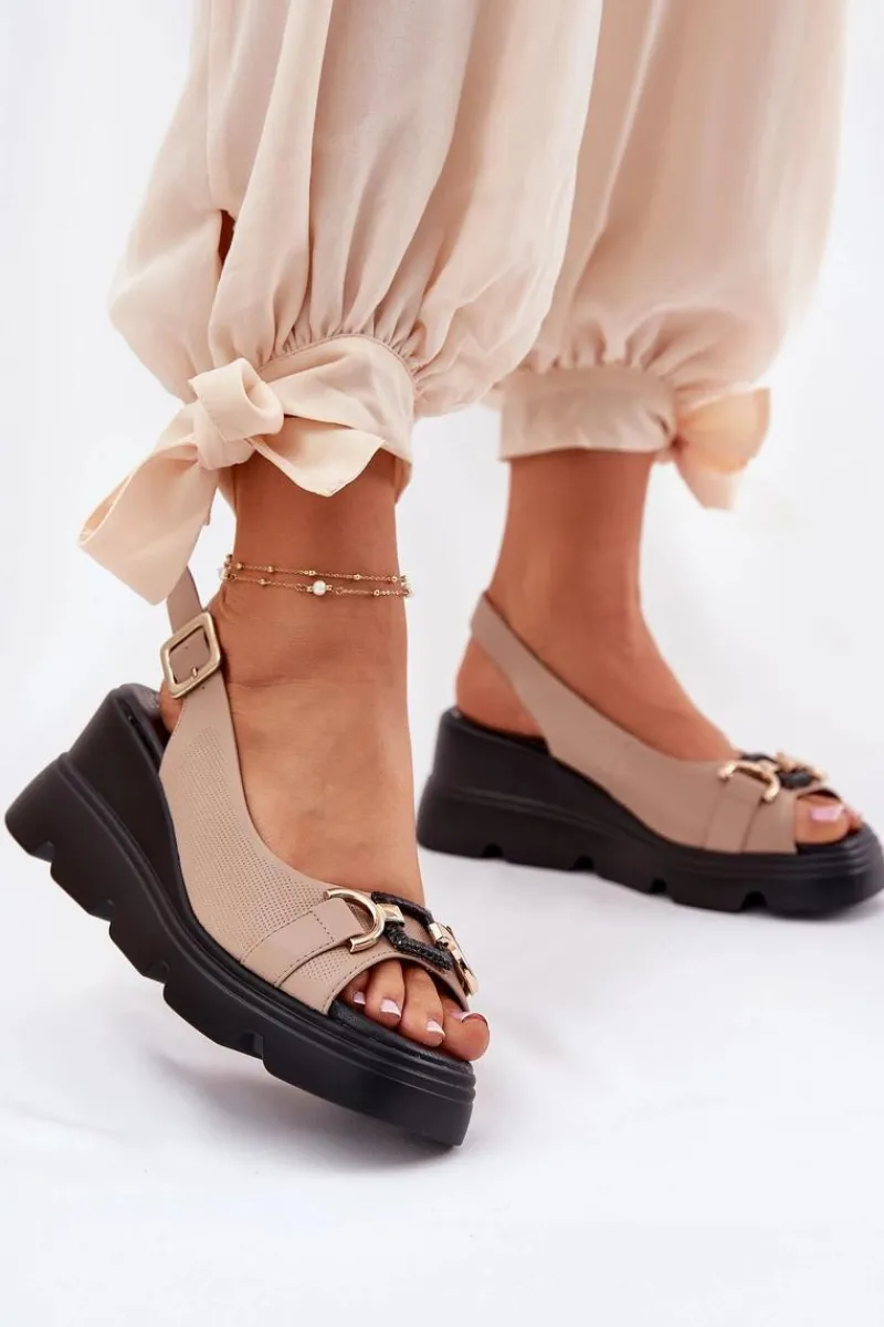 Damskie sandały wykonane z wysokiej jakości naturalnej skóry to połączenie elegancji i komfortu. Osadzone na platformie i koturnie, zapewniają wygodę oraz stabilność przez cały dzień. Z przodu znajduje się subtelny ozdobny detal, który dodaje im wyjątkowego charakteru. Miękka wkładka gwarantuje komfort noszenia, a zapinanie na klamrę z regulowanym paskiem umożliwia idealne dopasowanie do stopy. Te sandały to doskonały wybór do letnich stylizacji, idealne na różne okazje. Przy wyborze rozmiaru prosimy sugerować się tabelą rozmiarów.
