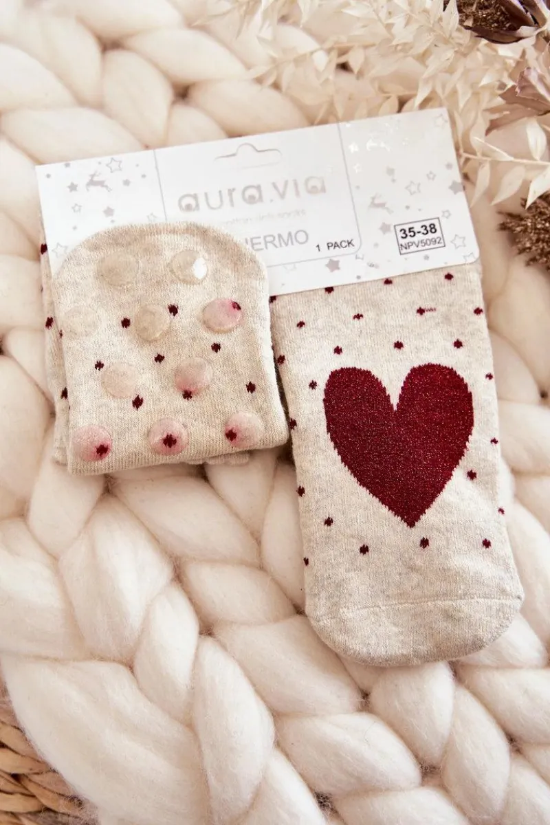 Te grube, termoaktywne skarpetki damskie zostały wykonane głównie z bawełny. Idealnie sprawdzą się podczas chłodnych, zimowych dni. Posiadają urocze wzory. Delikatny ściągacz sprawi, że będą idealnie dopasowane do tęgości nogi. Dodatkowo skarpetki te posiadają oddychającą podeszwę i są antypoślizgowe.