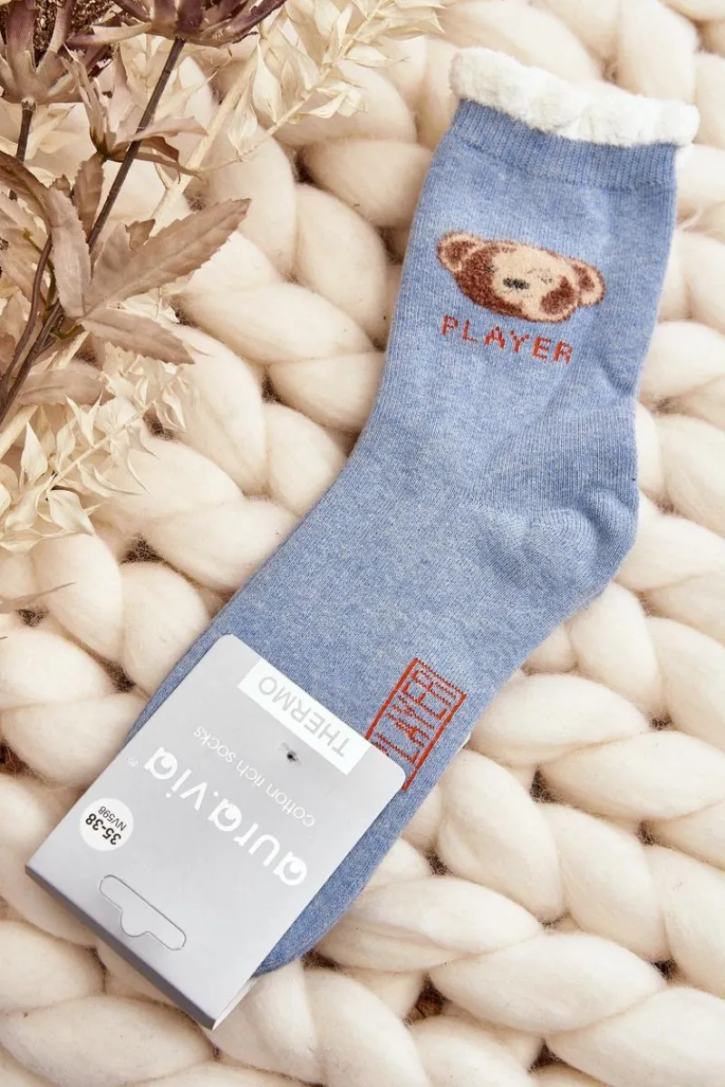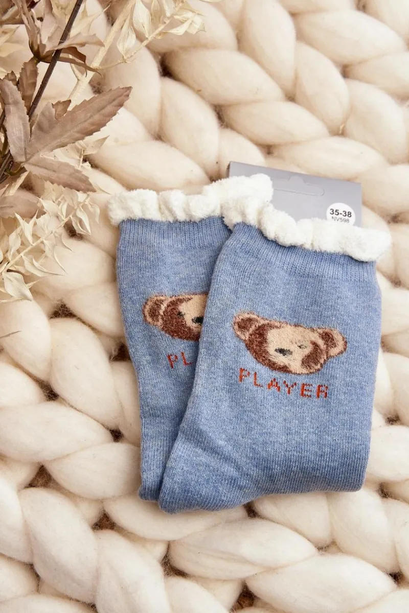 Ciepłe skarpety damskie idealne na mroźne dni. Model z naszywką w postaci misia. Lekki ściągacz sprawi, że będą idealnie dopasowane do tęgości nogi. Koniecznie powinnaś je mieć!