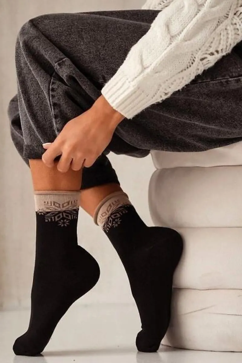 Model damskich skarpetek termoaktywnych ze wzmocnioną podeszwą frotte i uroczym wzorem. Jeśli uprawiasz takie dyscypliny sportowe, jak jak tenis, bieganie czy nordic walking, z pewnością sprawdzą Ci się ze względu na ich dużą wytrzymałość. Jednakże będą odpowiednie również do innych dyscyplin zapewniając pełen komfort noszenia.
