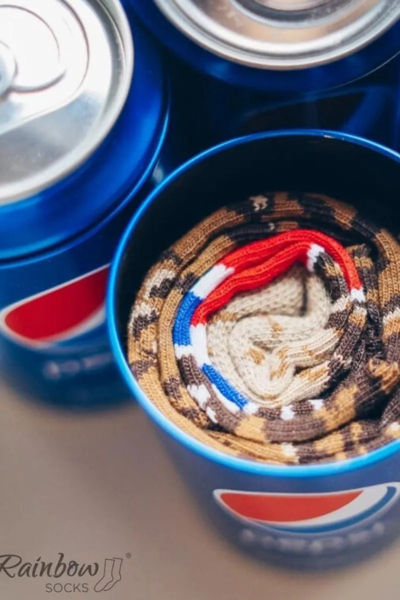 Pepsi… pysznie gazowana , najlepiej z lodem. Już sięgasz po łyka? Chwileczkę, to przecież skarpetki! Puszka do złudzenia przypominająca oryginalne opakowanie skrywa niezwykłe wnętrze. Tym razem to nie drink, ale coś zaskakującego – parę skarpetek z Pepsi. Zażartuj i rozbaw swoich przyjaciół tym nietypowym gadżetem!