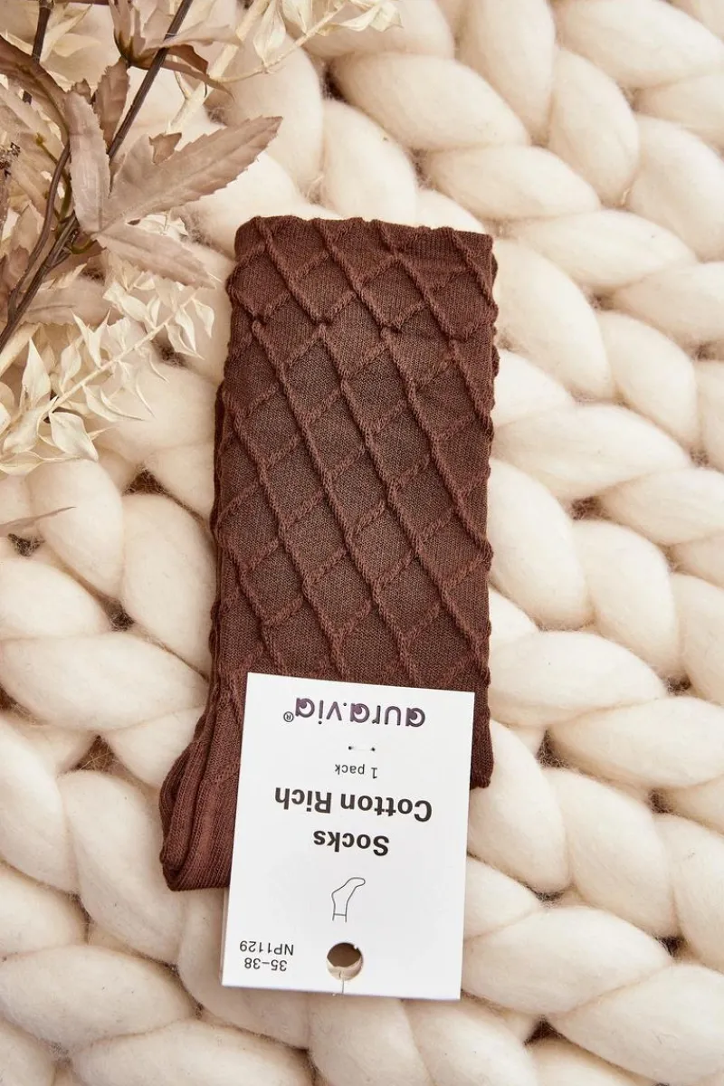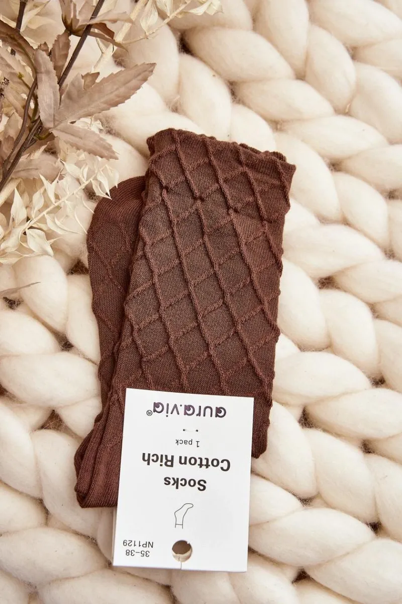 Damskie skarpety z ozdobnym tłoczeniem, świetnie sprawdzą się podczas chłodnych dni. Wykonane głównie z bawełny. Idealne jako dodatek do świątecznego prezentu. Koniecznie powinnaś je mieć!