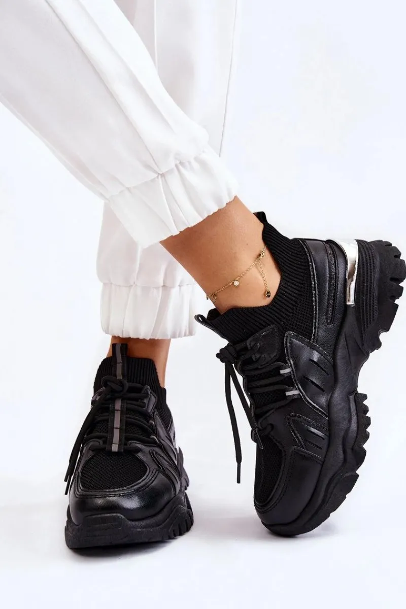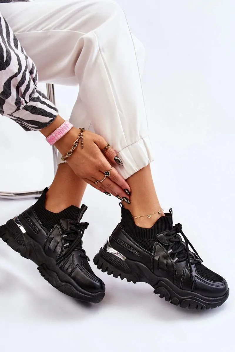 Buty sportowe zostały wykonane z połączenia eko skóry oraz materiału tekstylnego. Model wsuwany z dodatkowym sznurowaniem. Buty zostały osadzone na masywnej platformie z płaskim obcasem i żłobieniami. Miękka wkładka zapewni komfortowe użytkowanie obuwia. Koniecznie powinnaś je mieć! Przy wyborze rozmiaru prosimy sugerować się tabelą rozmiarów.
